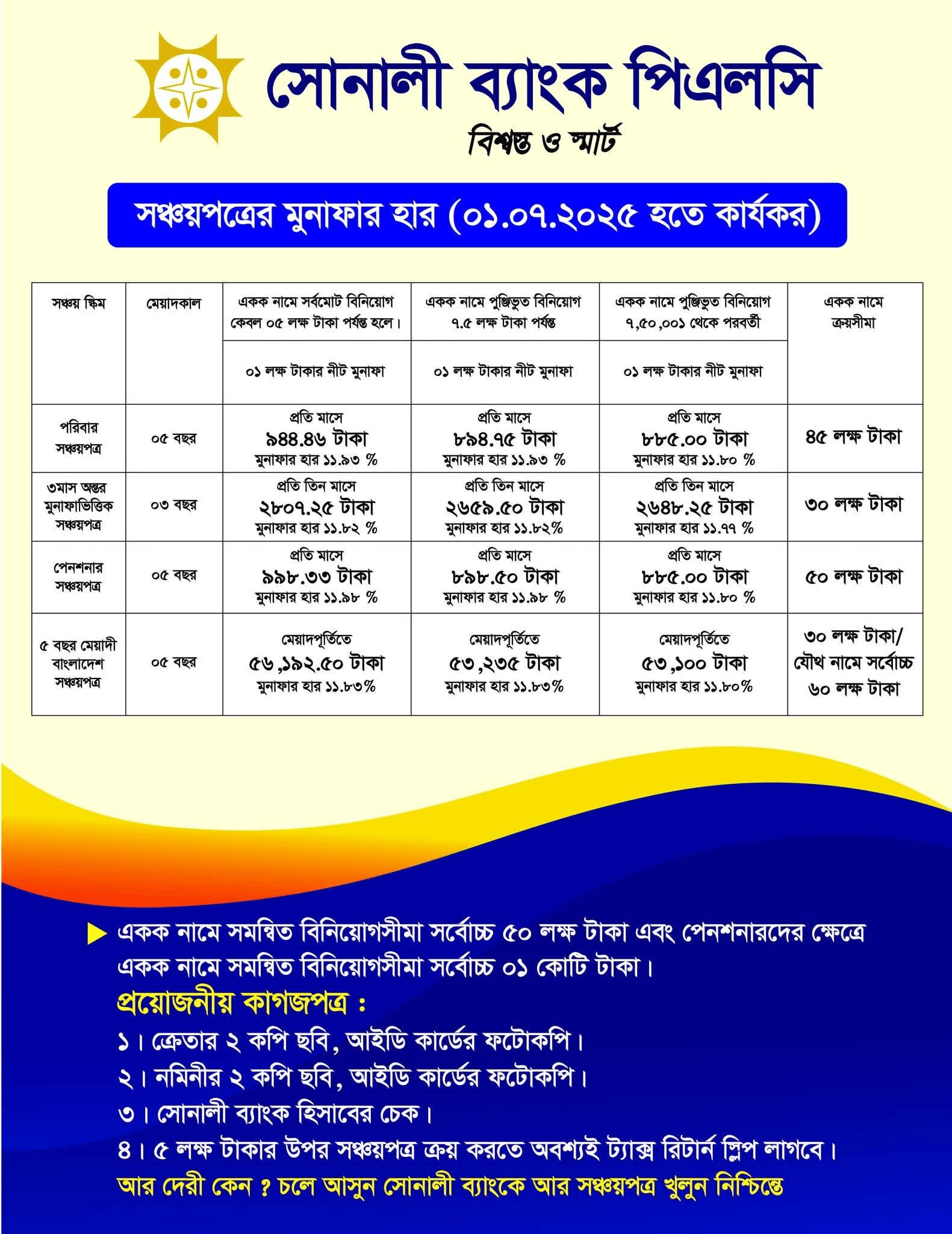 | ৩-মাস অন্তর মুনাফাভিত্তিক সঞ্চয়পত্র | ১ম বছরান্তে | ১০.৬৫% | ১১.৬০% | |