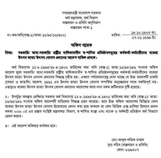 - মোট কথা উৎসব ভাতা প্রদান কালীন সময় তার চাকরিকাল হিসাবে গন্য করা না হলে বকেয়া উৎসব ভাতা উত্তোলন করা যাইবে না