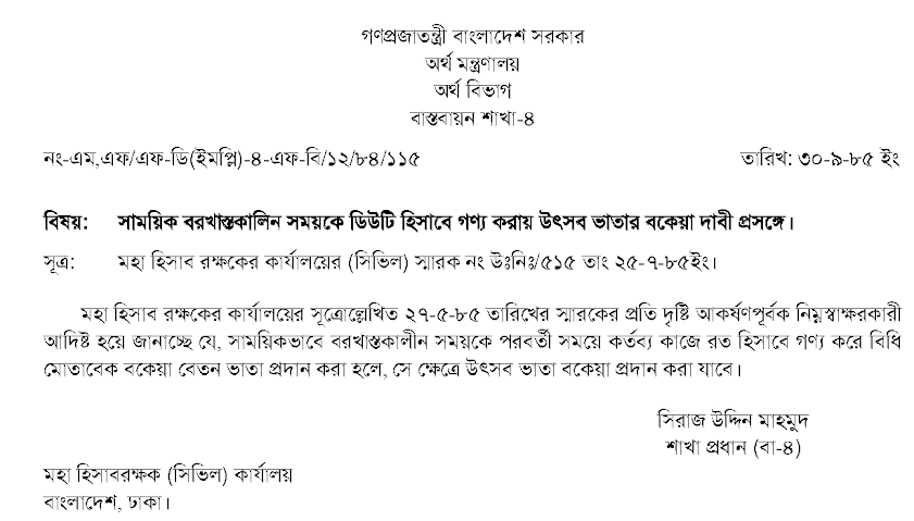 হয়। কিন্তু আংশিক বকেয়া হয় না। সাময়িক বরখাস্তকালীন সময়কে ডিউটি হিসেবে গণ্য করায় উৎসব ভাতার বকেয়া দাবি প্রসঙ্গে। এই আদেশের মূল বক্তব্য (যা মহাহিসাব রক্ষকের কার্যালয়ের ২৯-৬-৮৫ তারিখের স্মারকের প্রতি উত্তরে বলা হয়েছে) হলো: “মহাহিসাব রক্ষকের কার্যালয়ের সুত্রে উল্লেখিত ২৯-৬-৮৫ তারিখের স্মারকের প্রতি দৃষ্টি আকর্ষণপূর্বক নিম্নস্বাক্ষরকারী আদিষ্ট হয়ে জানাচ্ছে যে, সাময়িকভাবে বরখাস্তকালীন সময়কে পরবর্তী কর্তব্যে কাজে রত হিসাবে গণ্য করে বিধি মোতাবেক বকেয়া বেতন ভাতা প্রদান করা হলে, সে ক্ষেত্রে উৎসব ভাতা প্রদান করা যাবে।”