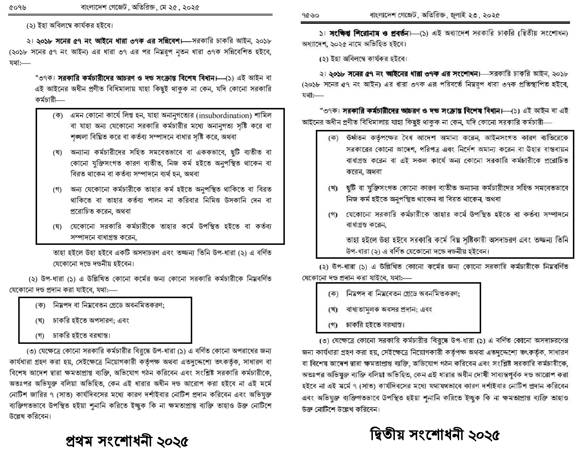 সরকারি চাকরি আইন সংশোধন (২য়) ২০২৫ । নতুন আইন অনুযায়ী, সরকারি কর্মচারীদের বিরুদ্ধে শাস্তির প্রক্রিয়া দ্রুত সম্পন্ন করার ওপর জোর দেওয়া হয়েছে।