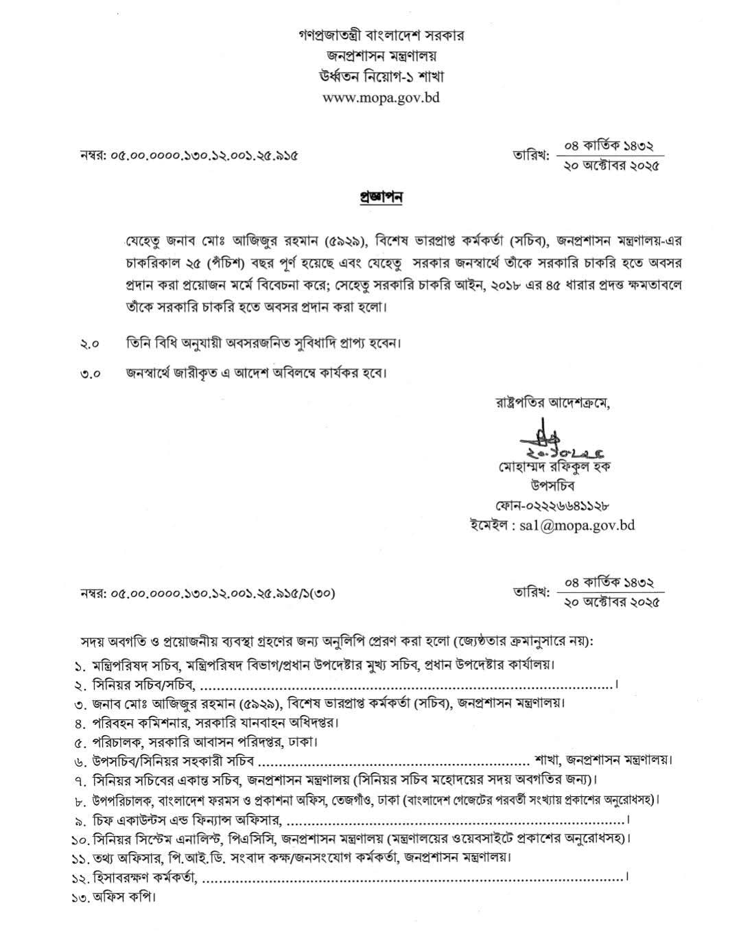 সরকারি চাকরি হইতে অবসর ধারা ২০২৫ । ৯ জন সচিব-কে জনস্বার্থে ৫৭ ধারায় বাধ্যতামূলক অবসর?