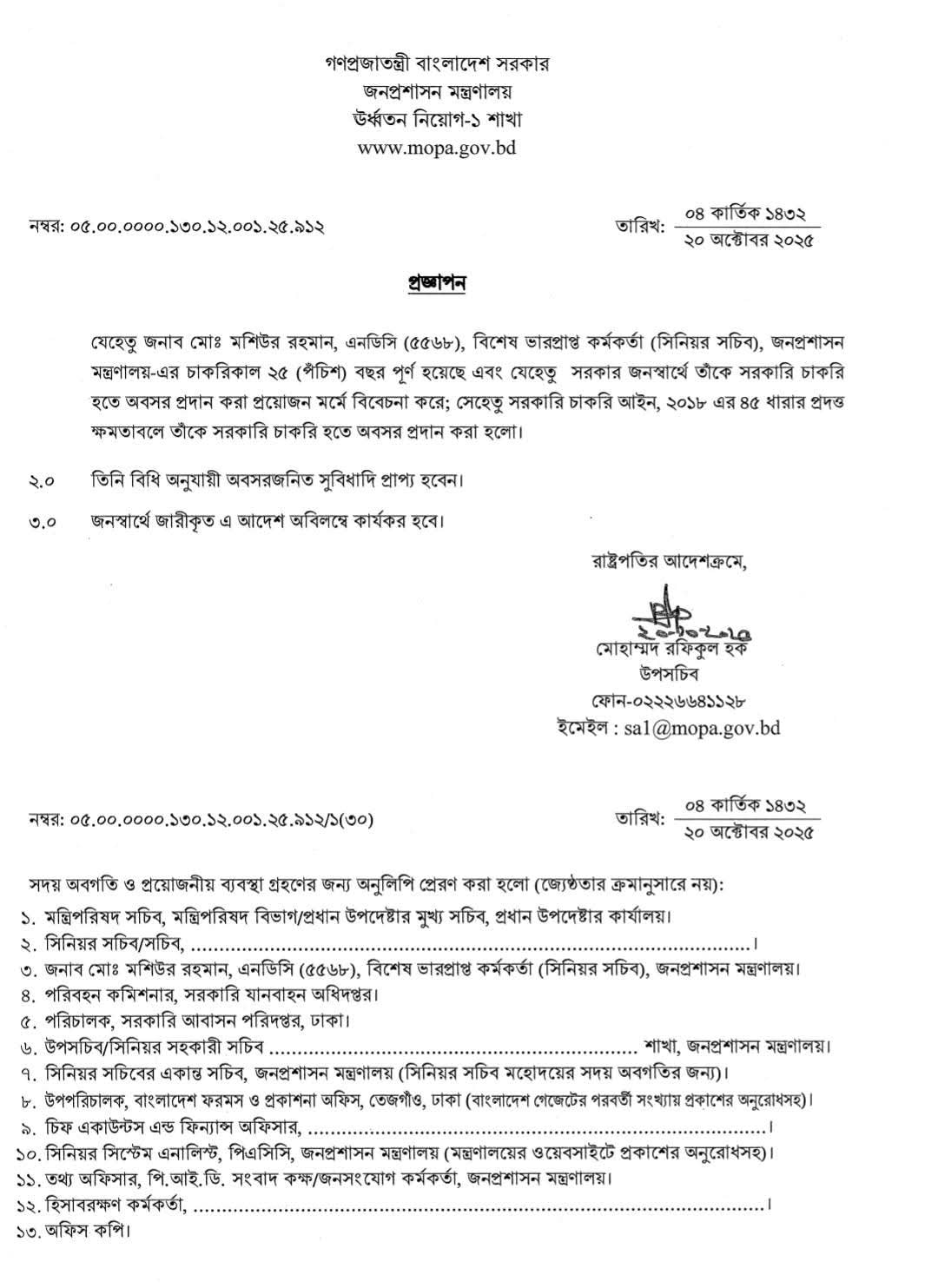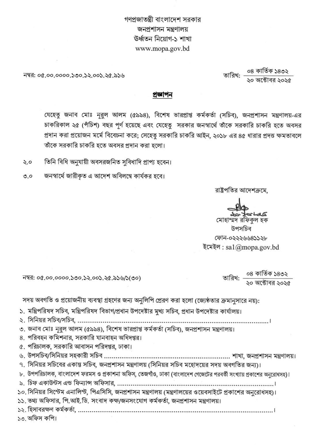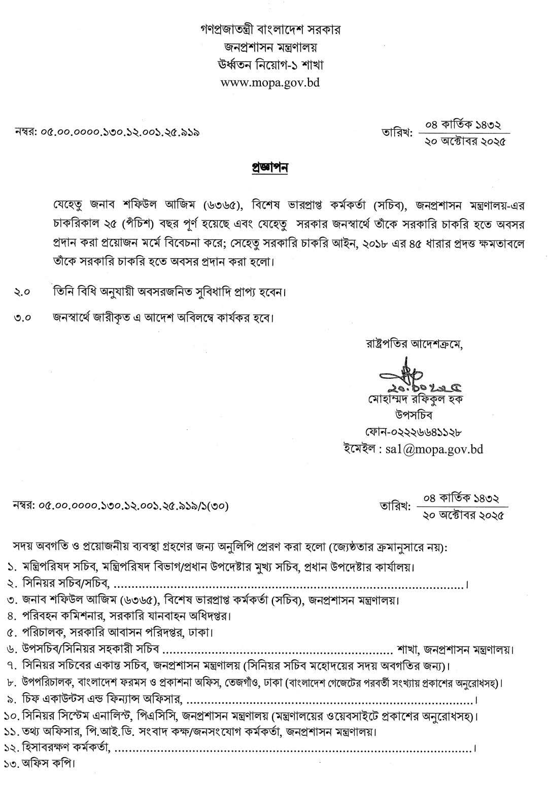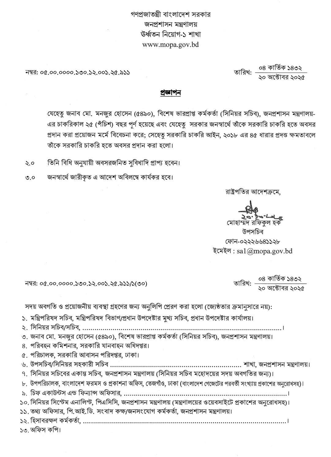 সরকারি চাকরি হইতে অবসর ধারা ২০২৫ । ৯ জন সচিব-কে জনস্বার্থে ৫৭ ধারায় বাধ্যতামূলক অবসর?