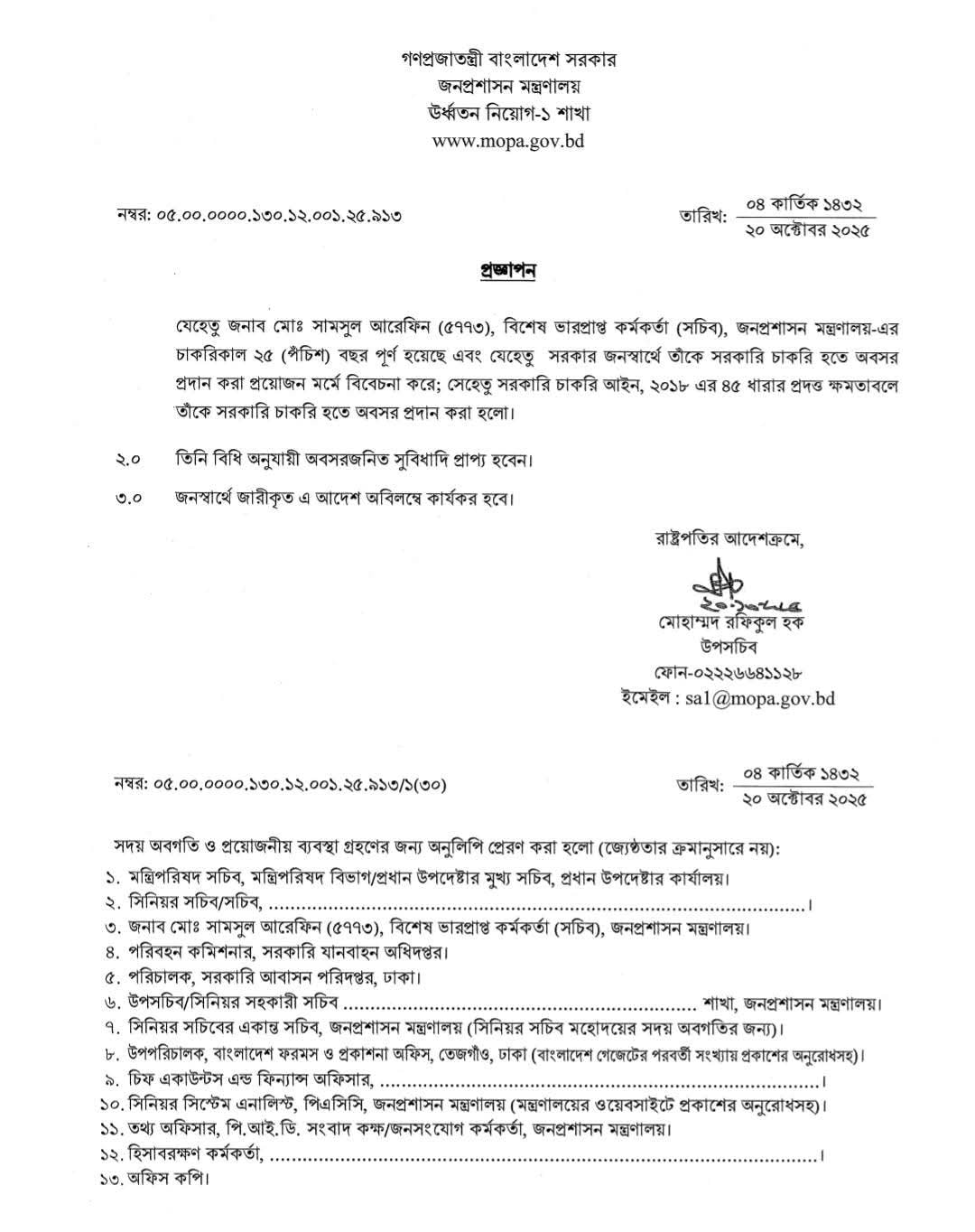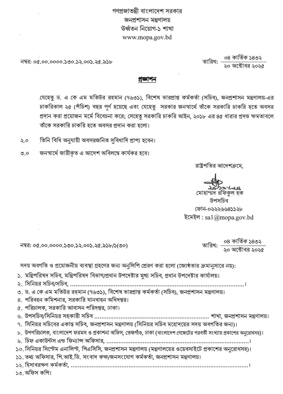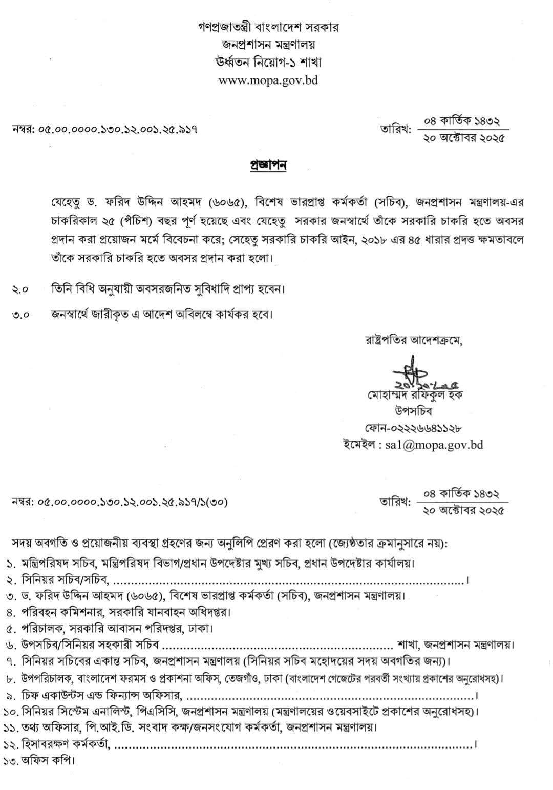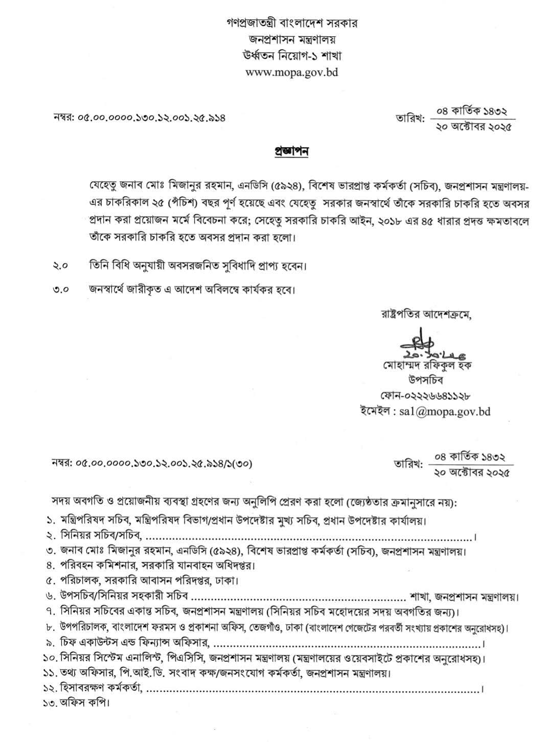 সরকারি চাকরি হইতে অবসর ধারা ২০২৫ । ৯ জন সচিব-কে জনস্বার্থে ৫৭ ধারায় বাধ্যতামূলক অবসর?