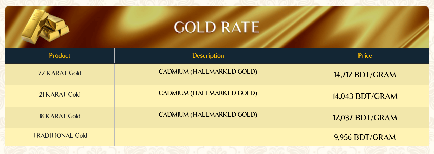 - ১৮ ক্যাঃ ক্যাডমিয়াম (হলমার্ককৃত) প্রতি গ্রাম স্বর্ণের মূল্য ১২,০৩৭ টাকা।