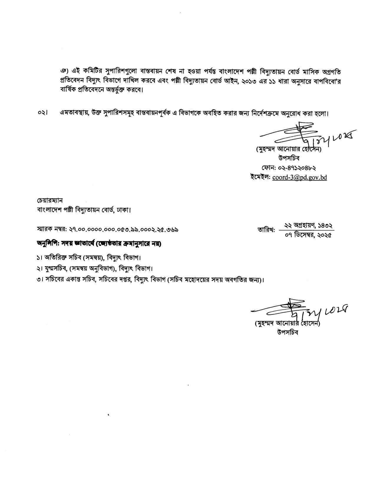০৭ ডিসেম্বর, ২০২৫ তারিখে (২২ অগ্রহায়ণ, ১৪৩২) বিদ্যুৎ বিভাগ থেকে জারি করা এক স্মারকে (২৭.০০.০০০০.০০০.০৫৩.৯৯.০০০২.২৫.৩৬৯) বাংলাদেশ পল্লী বিদ্যুতায়ন বোর্ডকে (বাপবিবো) এই সুপারিশগুলো বাস্তবায়ন করতে বলা হয়েছে ।