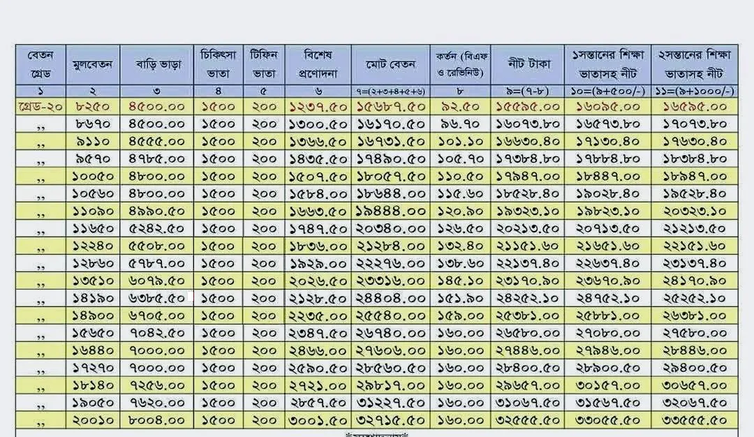 না। ১১-১৬ গ্রেড (তৃতীয় শ্রেণি) এই গ্রেডের কর্মচারীরা সাধারণত অফিস সহকারী, কম্পিউটার মুদ্রাক্ষরিক ইত্যাদি পদে কাজ করেন। তাদের বেতন গ্রেড অনুযায়ী ৯,৩০০ থেকে ২২,৪৯০ টাকা পর্যন্ত হতে পারে।এই গ্রেডের কর্মচারীরা সাধারণত পরিচ্ছন্নতা কর্মী, নিরাপত্তা প্রহরী ইত্যাদি পদে কাজ করেন। তাদের বেতন গ্রেড অনুযায়ী ৮,২৫০ টাকা থেকে শুরু হয়। কর্মচারীরা মূল বেতনের পাশাপাশি বাড়িভাড়া ভাতা (বেতনের একটি অংশ), চিকিৎসা ভাতা (বেতন স্কেলের ভিত্তিতে), এবং পরিবহন ভাতা পেয়ে থাকেন। এছাড়া, কিছু কিছু ক্ষেত্রে অন্যান্য ভাতাও প্রদান করা হয়। ১১ থেকে ২০ গ্রেডের কর্মচারীদের সর্বমোট বেতন তাদের গ্রেড, চাকরির অভিজ্ঞতা, এবং অন্যান্য ভাতার উপর নির্ভর করে। উদাহরণস্বরূপ, কোনো কর্মচারী যদি ১১তম গ্রেডে থাকেন এবং তার মূল বেতন যদি ২০,০০০ টাকা হয়, তবে তিনি বাড়িভাড়া, চিকিৎসা ও পরিবহন ভাতা সহ সর্বমোট প্রায় ৩০,০০০-৩৫,০০০ টাকা পেতে পারেন। তবে, এই হিসাবটি একটি উদাহরণ, এবং প্রকৃত বেতন ভাতা সহ আরো বেশি বা কম হতে পারে। সরকারি চাকুরীজীবীদের বেতন-গ্রেড বৃদ্ধির সর্বশেষ আপডেট অনুযায়ী, ১১ থেকে ২০ গ্রেডের মূল বেতনের সর্বোচ্চ পার্থক্য সাড়ে ৩ হাজার এবং সর্বনিম্ন ২৫০ টাকা।