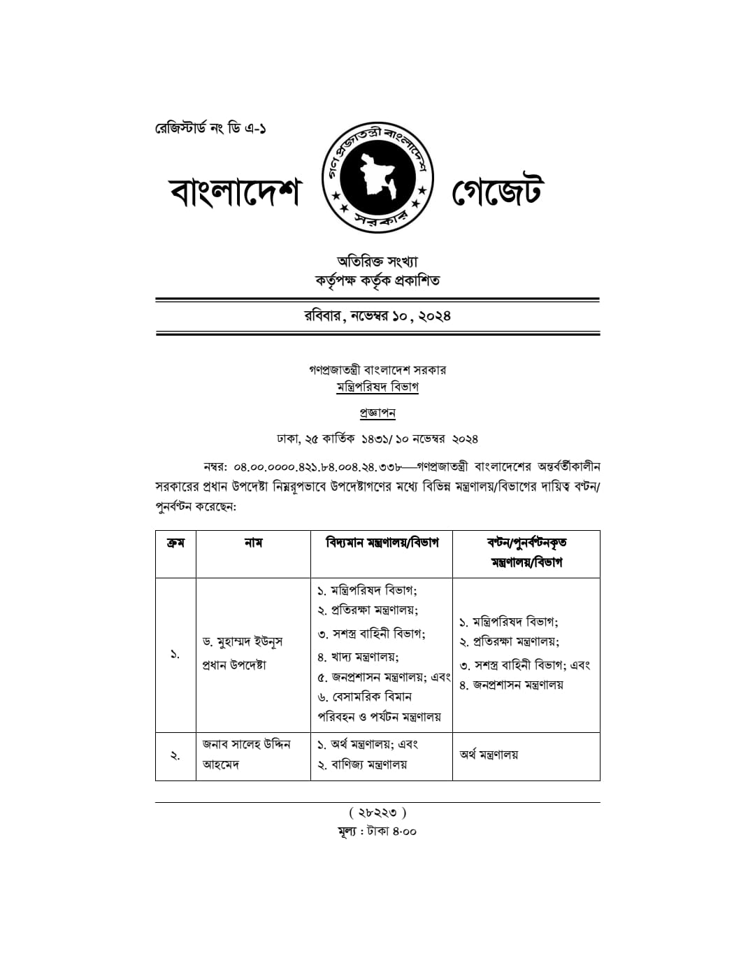 - প্রধান উপদেষ্টা ড. মুহাম্মদ ইউনূস-১. মন্ত্রিপরিষদ বিভাগ; ২. প্রতিরক্ষা মন্ত্রণালয়; ৩. সশস্ত্র বাহিনী বিভাগ; ৪. শিক্ষা মন্ত্রণালয়; ৫. সড়ক পরিবহন ও সেতু মন্ত্রণালয়; ৬. খাদ্য মন্ত্রণালয়; ৭. গৃহায়ণ ও গণপূর্ত মন্ত্রণালয়; ৮. ভূমি মন্ত্রণালয়; ৯. বস্ত্র ও পাট মন্ত্রণালয়; ১০. কৃষি মন্ত্রণালয়; ১১. বিজ্ঞান ও প্রযুক্তি মন্ত্রণালয়; ১২. রেলপথ মন্ত্রণালয়; ১৩. জনপ্রশাসন মন্ত্রণালয়; ১৪. বিদ্যুৎ, জ্বালানি ও খনিজ সম্পদ মন্ত্রণালয়; ১৫. নৌ-পরিবহন মন্ত্রণালয়; ১৬. পানি সম্পদ মন্ত্রণালয়; ১৭. মহিলা ও শিশু বিষয়ক মন্ত্রণালয়; ১৮. দুর্যোগ ব্যবস্থাপনা ও ত্রাণ মন্ত্রণালয়; ১৯. তথ্য ও সম্প্রচার মন্ত্রণালয়; ২০. প্রবাসী কল্যাণ ও বৈদেশিক কর্মসংস্থান মন্ত্রণালয়; ২১. বাণিজ্য মন্ত্রণালয়; ২২. শ্রম ও কর্মসংস্থান মন্ত্রণালয়; ২৩. সংস্কৃতি বিষয়ক মন্ত্রণালয়; ২৪. বেসামরিক বিমান পরিবহন ও পর্যটন মন্ত্রণালয়; ২৫. মুক্তিযুদ্ধ বিষয়ক মন্ত্রণালয়; ২৬. পার্বত্য চট্টগ্রাম বিষয়ক মন্ত্রণালয়; ২৭. প্রাথমিক ও গণশিক্ষা মন্ত্রণালয়