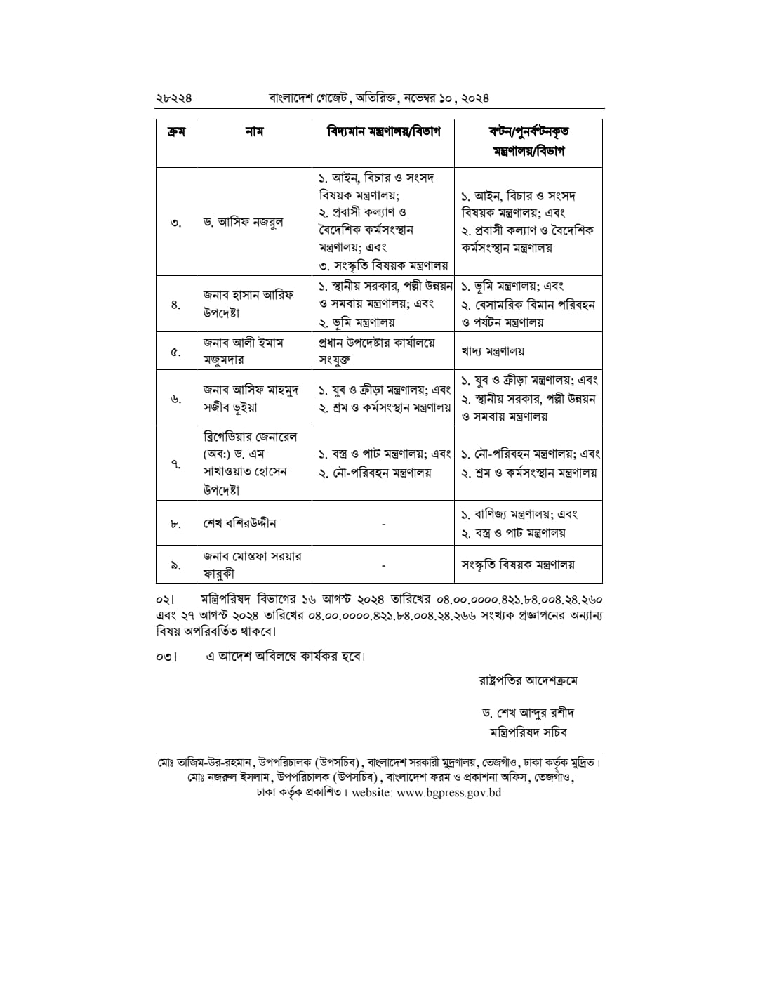 - আলী ইমাম মজুমদার- প্রধান উপদেষ্টার কার্যালয়ে সংযুক্ত (ঐ দিনই অবসান করা হয়েছে)