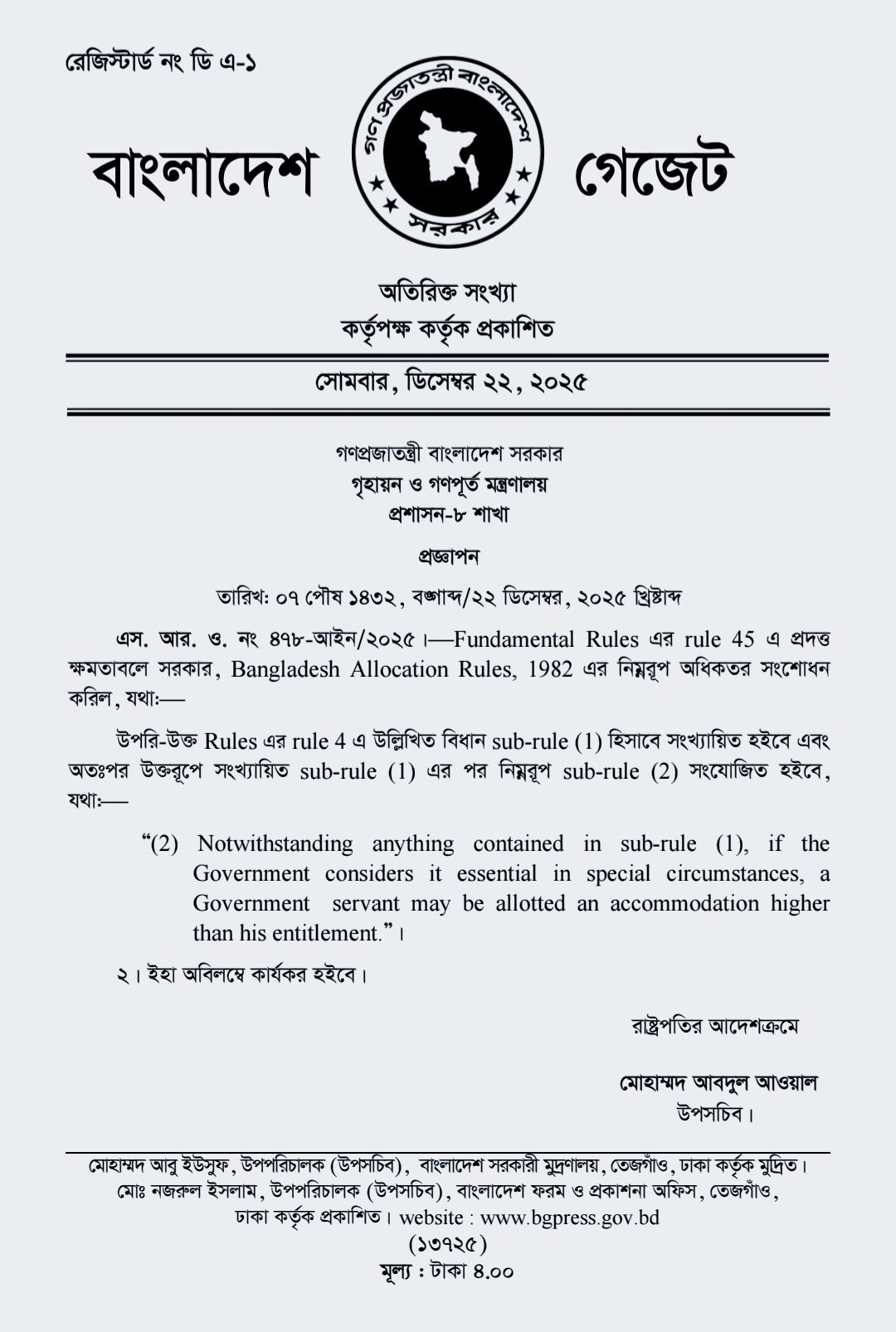 Bangladesh Allocation Rules, 1982’ এর বিধি-৪ এ সংশোধন এনেছে