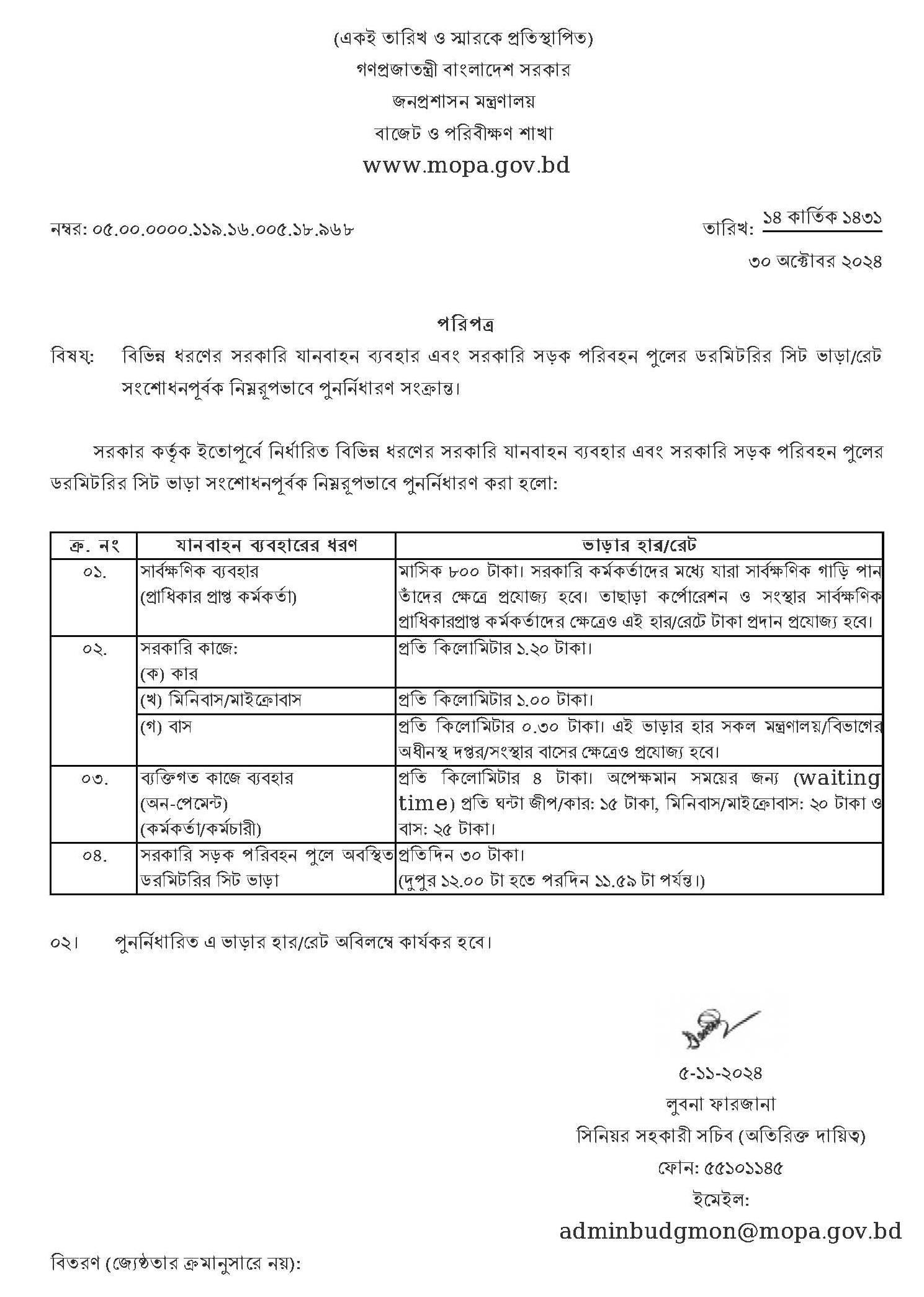 পরিপত্র (বিভিন্ন ধরণের সরকারি যানবাহন ব্যবহার এবং সরকারি সড়ক পরিবহন পুলের ডরমিটরির সিট ভাড়া/রেট সংশোধনপূর্বক পুনর্নিধারণ সংক্রান্ত)