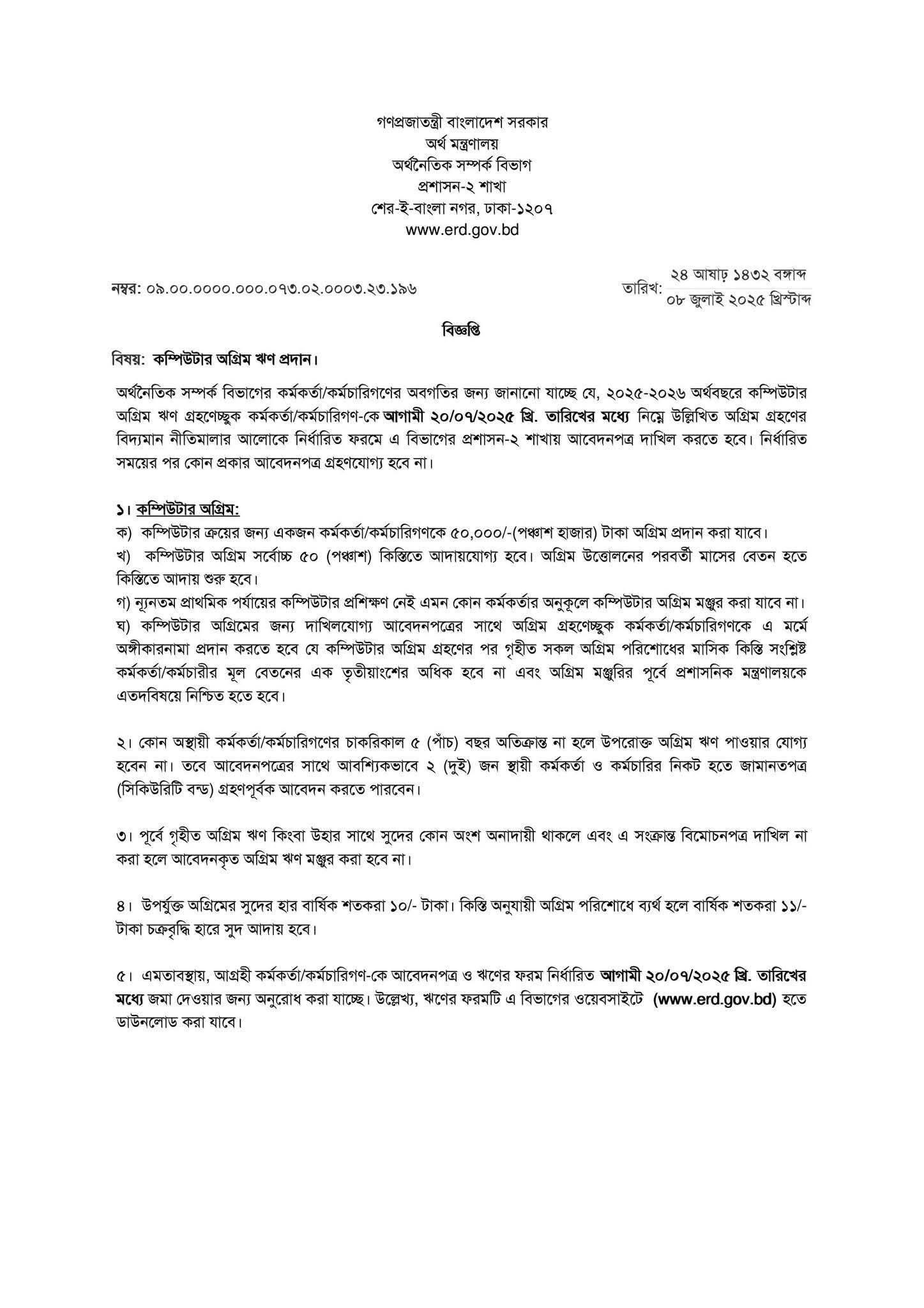 কম্পিউটার অগ্রিম ঋণ গ্রহণেচ্ছুক কর্মকর্তাগণকে আগামী ২০/০৭/২০২৫ তারিখের মধ্যে নিম্নে বর্ণিত অগ্রিম গ্রহণের বিদ্যমান নীতিমালার আলোকে নির্ধারিত ফরমে এ বিভাগের প্রশাসন-২ শাখায় আবেদনপত্র দাখিল করতে হবে। নির্ধারিত সময়ের পর কোন প্রকার আবেদনপত গ্রহণ করা হবে না-Govt. Computer Loan 2025