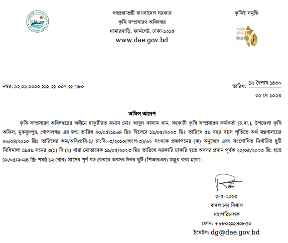 অবসর উত্তর ছুটি মঞ্জুরীর আদেশ জারি । চাকরি শেষ হওয়ার পরের দিন হতে পিআরএল ১ বছরের জন্য শুরু হয়