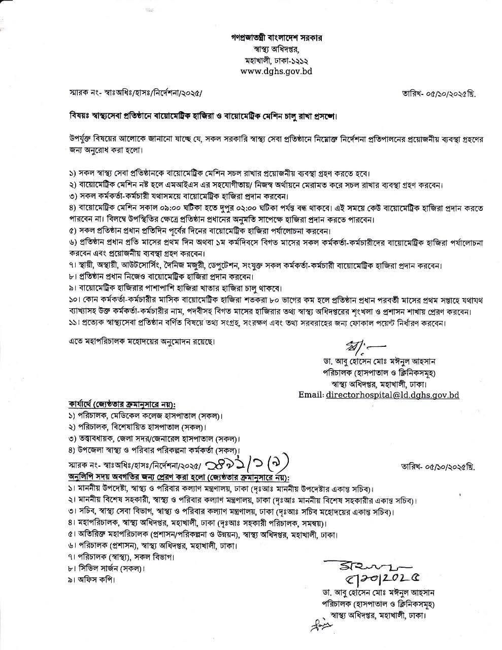 দেশের সকল সরকারি স্বাস্থ্য প্রতিষ্ঠানে কর্মরত কর্মকর্তা-কর্মচারীদের উপস্থিতি নিশ্চিত করতে বায়োমেট্রিক হাজিরা পদ্ধতি বাধ্যতামূলক করেছে স্বাস্থ্য অধিদপ্তর। গত ০৫/১০/২০২৫ তারিখে স্বাস্থ্য অধিদপ্তরের পরিচালক (হাসপাতাল ও ক্লিনিকসমূহ) অধ্যাপক ডাঃ মো. রুবায়েত ইবনে আলী স্বাক্ষরিত এক নির্দেশনায় এই তথ্য জানানো হয়েছে। নির্দেশনায় বলা হয়েছে, সরকারি স্বাস্থ্য প্রতিষ্ঠানের নিয়োগ নির্দেশিকা/প্রবিধানমালা অনুযায়ী কর্ম ঘণ্টা অনুসরণ করে উপস্থিতি নিশ্চিত করতে হবে।