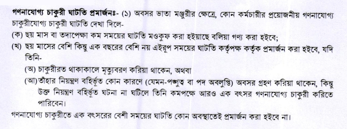 সরকারি পেনশনযোগ্য চাকুরীতে ঘাটতি মওকুফকরণের নিয়ম- ছয় মাস বা তাহার কম পেনশনযোগ্য চাকরিতে ঘাটতি পড়িলে তাহা অবশ্যই মওকুফ করিতে হইবে। ছয় মাসের বেশি কিন্তু এক বৎসরের কম পেনশনযোগ্য চাকুরীতে ঘাটতি পড়িলে নিম্নবর্ণিত ছুটির শর্তে উহা মওকুফ করা যাইতে পারে-Govt. Job Age Relaxation Process bd 2025
