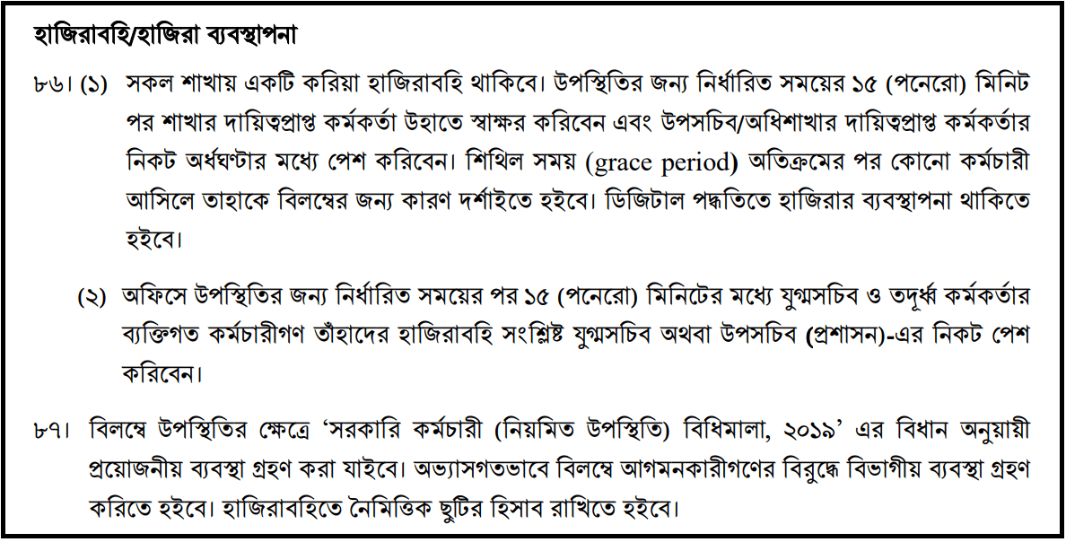 হাজিরা গ্রেস পিরিয়ড কি ১৫ মিনিট? সকল শাখায় একটি করিয়া হাজিরাবহি থাকিবে। উপস্থিতির জন্য নির্ধারিত সময়ের ১৫ (পনেরো) মিনিট পর শাখার দায়িত্বপ্রাপ্ত কর্মকর্তা উহাতে স্বাক্ষর করিবেন এবং উপসচিব/অধিশাখার দায়িত্বপ্রাপ্ত কর্মকর্তার নিকট অর্ধঘণ্টার মধ্যে পেশ করিবেন। শিথিল সময় (grace period) অতিক্রমের পর কোনো কর্মচারী আসিলে তাহাকে বিলম্বের জন্য কারণ দর্শাইতে হইবে। ডিজিটাল পদ্ধতিতে হাজিরার ব্যবস্থাপনা থাকিতে হইবে।