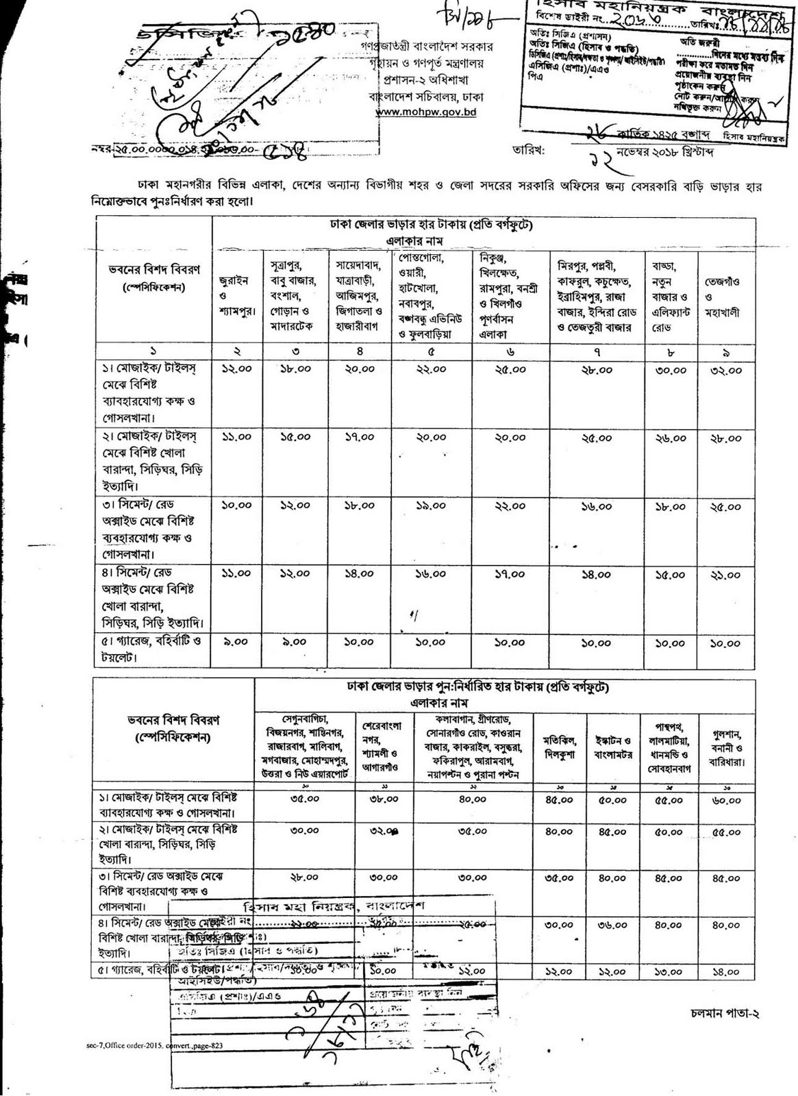 ঢাকা মহানগরীর বিভিন্ন এলাকা, দেশের অন্যান্য বিভাগীয় শহর ও জেলা সদরের সরকারী অফিসের জন্য বেসরকারি বাড়ি ভাড়ার হার পুন:নির্ধারণ সংক্রান্ত আদেশ জারি করেছে গৃহায়ন ও গণপুর্ত মন্ত্রণালয়ের প্রশাসন-২ । পূর্বের হারে ঢাকায় প্রতি বর্গফুট ১০ টাকা থেকে ৩২ টাকা পর্যন্ত। বর্তমান পুন:নির্ধারিত হারে প্রতি বর্গফুট ১৪ টাকা থেকে ৬০ টাকা।