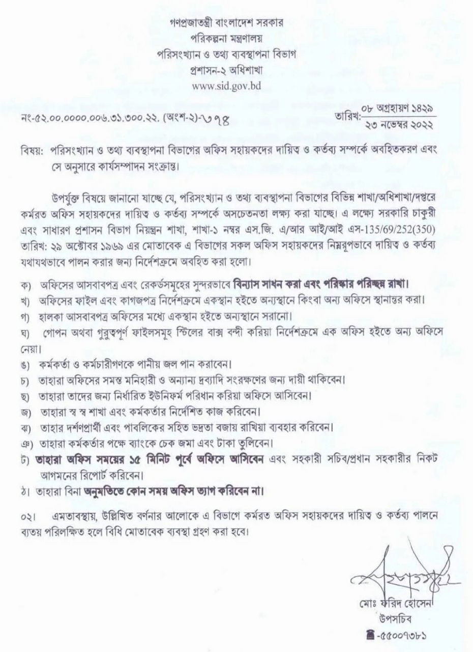 পরিসংখ্যান ও তথ্য ব্যবস্থাপনা বিভাগের আওতাধীন বিভিন্ন শাখা, অধিশাখা ও দপ্তরে কর্মরত অফিস সহায়কদের দায়িত্ব ও কর্তব্য পালনে অসচেতনতা লক্ষ্য করার পর সরকার কঠোর পদক্ষেপ নিয়েছে। ২৯ অক্টোবর ১৯৬৯ সালের সরকারি চাকুরী এবং সাধারণ প্রশাসন বিভাগের নিয়ন্ত্রন শাখা থেকে জারি করা প্রজ্ঞাপন (এস.জি. এ/আর আই/আই এস-135/69/252(350)) মোতাবেক তাদের জন্য নির্দিষ্ট দায়িত্ব ও কর্তব্যসমূহ পালনের নির্দেশক্রমে একটি সার্কুলার জারি করা হয়েছে।