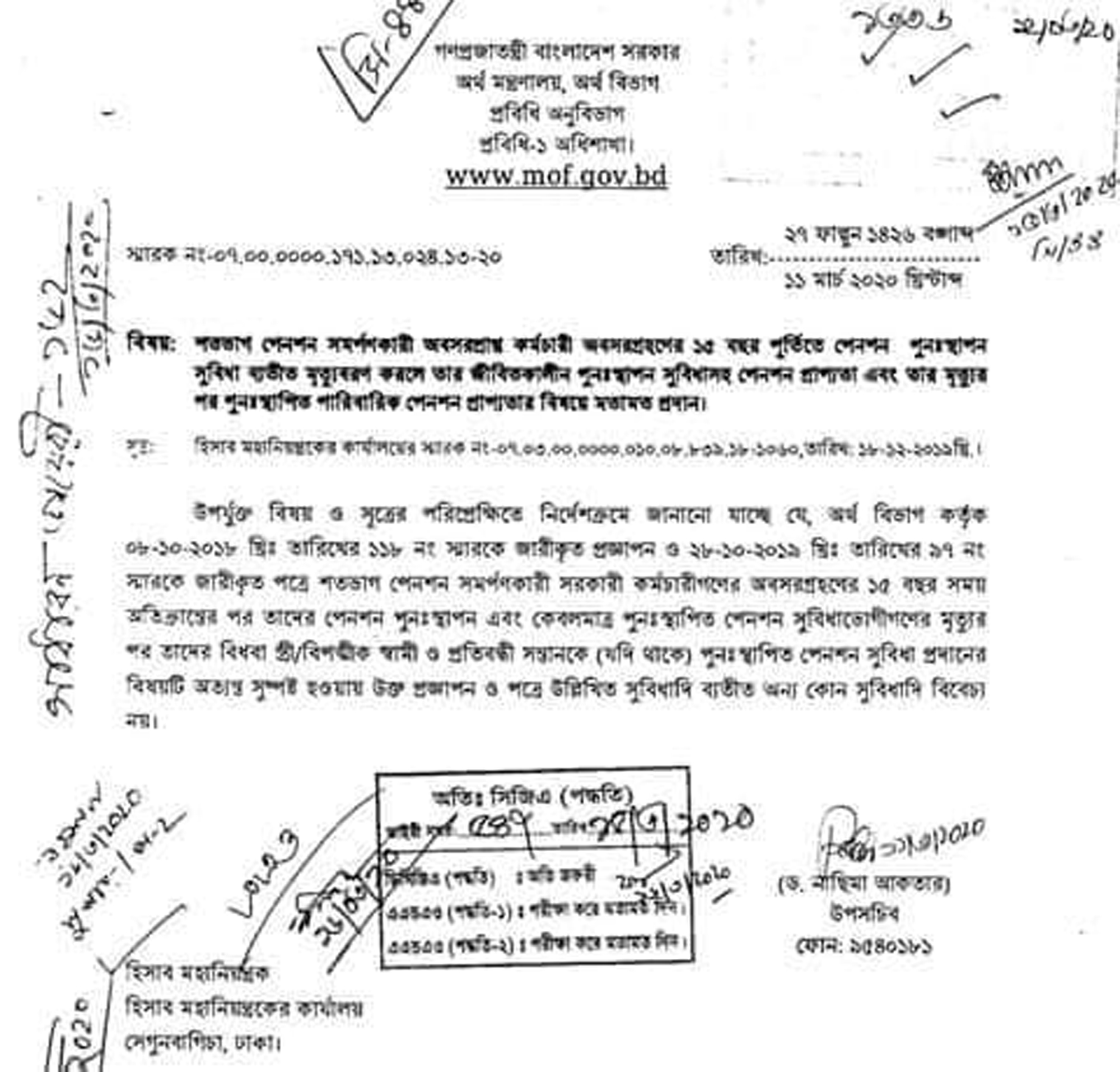 উপর্যুক্ত বিষয় ও সূত্রের পরিপ্রেক্ষিতে নির্দেশক্রমে জানানো যাচ্ছে যে, অর্থ বিভাগ কর্তৃক ০৮.১০.২০১৮ খ্রি: তারিখের ১১৮ নং স্মারকে জারীকৃত প্রজ্ঞাপন ও ২৮.১০.২০১৯ খ্রি: তারিখের ৯৭ ন স্মারকে জারীকৃত পত্রে শতভাগ পেনশন সমর্পণকারী সরকারী কর্মচারীগণের অবসরগ্রহণের ১৫ বছর সময় অতিক্রান্তের পর তাদের পেনশন পুন:স্থাপন এবং কেবলমাত্র পুন:স্থাপিত পেনশন সুবিধাভোগীদের মৃত্যুর পর তাদের বিধবা স্ত্রী / বিপত্নীক স্বামী ও প্রতিবন্ধী সন্তান (যদি থাকে) পুন:স্থাপিত পেনশন সুবিধা প্রদানের বিষয়টি অত্যন্ত সুষ্পষ্ট হওয়ায় উক্ত প্রজ্ঞাপন ও পত্রে উল্লিখিত সুবিধাদি ব্যতীত অন্য কোন সুবিধা বিবেচ্য নয়।
