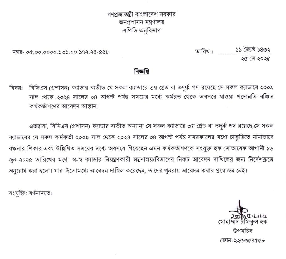 শুধু কর্মকর্তাদের এ সুযোগ? হ্যাঁ।– বিসিএস প্রশাসন ক্যাডার ব্যতিরেকে অন্যান্য ক্যাডারের ৩য় গ্রেড এবং তদুর্দ্ধ পদে (যে সব পদোন্নতির ক্ষেত্রে সুপিরিয়র সিলেকশন বোর্ডের সুপারিশ প্রযোজ্য) কর্মরত থেকে অবসরে যাওয়া যে সকল বঞ্চিত কর্মকর্তা এ কমিটির মাধ্যমে প্রতিকার পেতে চান তাঁদের প্রত্যেকের বঞ্চনার ধরণ ও কারণ উল্লেখপূর্বক সংশ্লিষ্ট নিয়ন্ত্রণকারী মন্ত্রণালয়/বিভাগের সিনিয়র সচিব/সচিব-এর বরাবর আগামী ১৬ জুন ২০২৫ তারিখের মধ্যে আবেদন করার জন্য পরামর্শ প্রদান করা হয়েছে।
