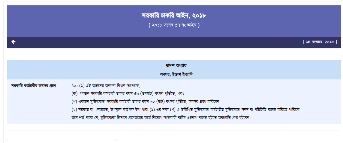সরকারি চাকরি আইন, ২০১৮ ( ২০১৮ সনের ৫৭ নং আইন ) যা ১৪ নভেম্বর, ২০১৮ মাসে প্রকাশিত হয়। এই আইন অর্থাৎ দ্বাদশ অধ্যায় সরকারি অবসর, ইস্তফা ইত্যাদি বিষয়ে বলা আছে। সরকারি কর্মচারীর অবসর গ্রহণ এর ৪৩। (১) এই আইনের অন্যান্য বিধান সাপেক্ষে,- (ক) একজন সরকারি কর্মচারী তাহার বয়স ৫৯ (ঊনষাট) বৎসর পূর্তিতে, এবং (খ) একজন মুক্তিযোদ্ধা সরকারি কর্মচারী তাহার বয়স ৬০ (ষাট) বৎসর পূর্তিতে, অবসর গ্রহণ করিবেন। (২) সরকার বা, ক্ষেত্রমত, উপযুক্ত কর্তৃপক্ষ উপ-ধারা (১) এর দফা (খ) এ উল্লিখিত মুক্তিযোদ্ধা কর্মচারীর মুক্তিযোদ্ধা সনদ বা পরিচিতি যাচাই করিতে পারিবে: তবে শর্ত থাকে যে, মুক্তিযোদ্ধা হিসাবে প্রজাতন্ত্রের কর্মে নিয়োগ লাভকারী ব্যক্তি এইরূপ যাচাই হইতে অব্যাহতি প্রাপ্ত হইবেন।