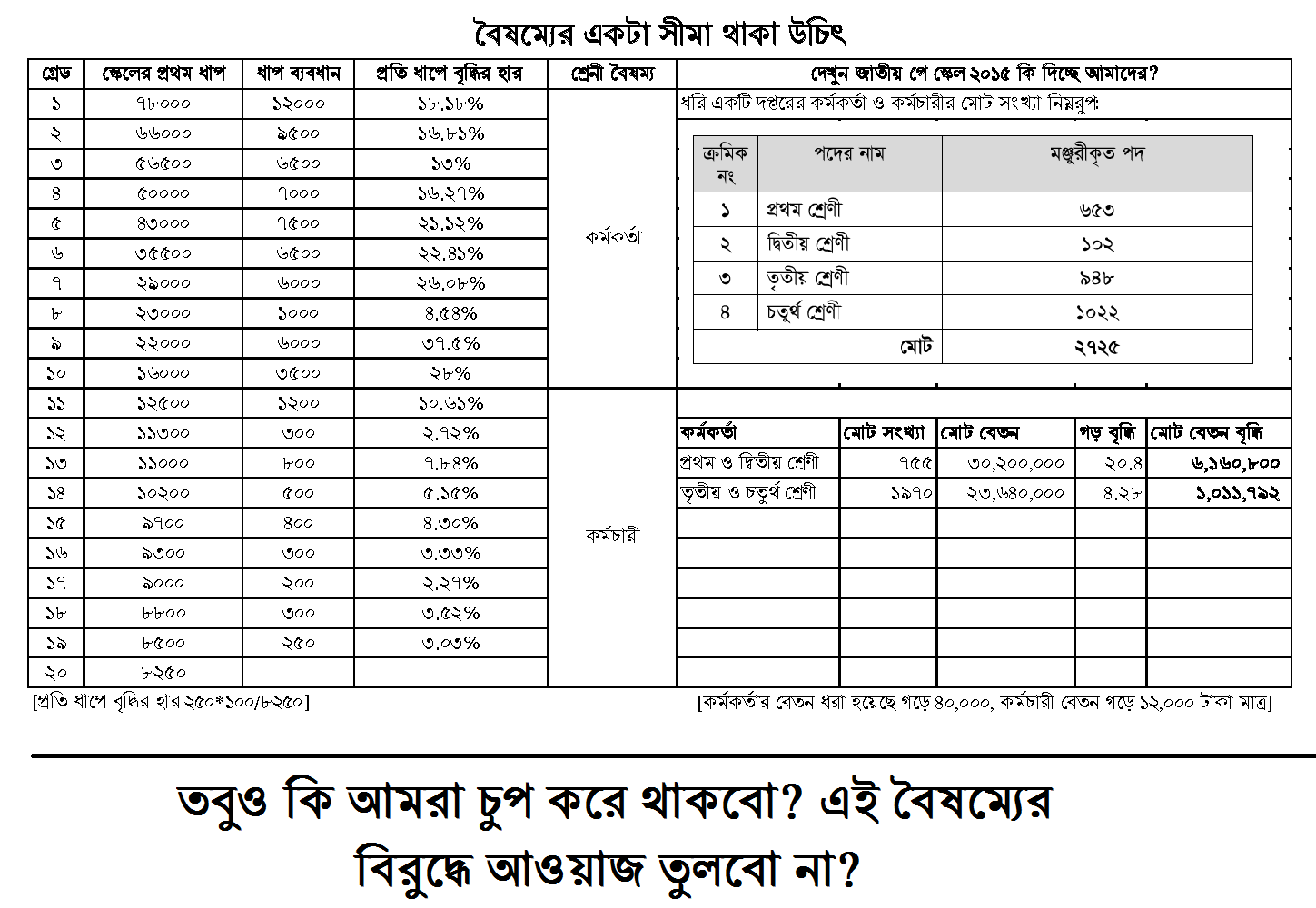 ২০১৫ সালের পে স্কেলে সুক্ষ্ন কারচুপির মাধ্যমে ১১-২০তম গ্রেডের সকল কর্মচারীদের ঠকানো হয়েছে। কর্মকর্তাদের বেতন ১৬০০০ টাকা থেকে সর্বোচ্চ ৭৮০০০ টাকা করা হয়েছে। যেখানে কর্মচারীদের বেতন ৮২৫০ টাকা থেকে সর্বোচ্চ ১২৫০০ টাকা করা হয়েছে। ১০ম-১ম গ্রেডে বেতন বৃদ্ধি করা হয়েছে ৬২০০০ টাকা। অপর দিকে ১১তম-২০তম গ্রেডে বেতন বৃদ্ধি করা হয়েছে ৪২৫০ টাকা। বাংলাদেশসহ ৫টি দেশের পে-স্কেলের তুলনামূলক আলোচনা।