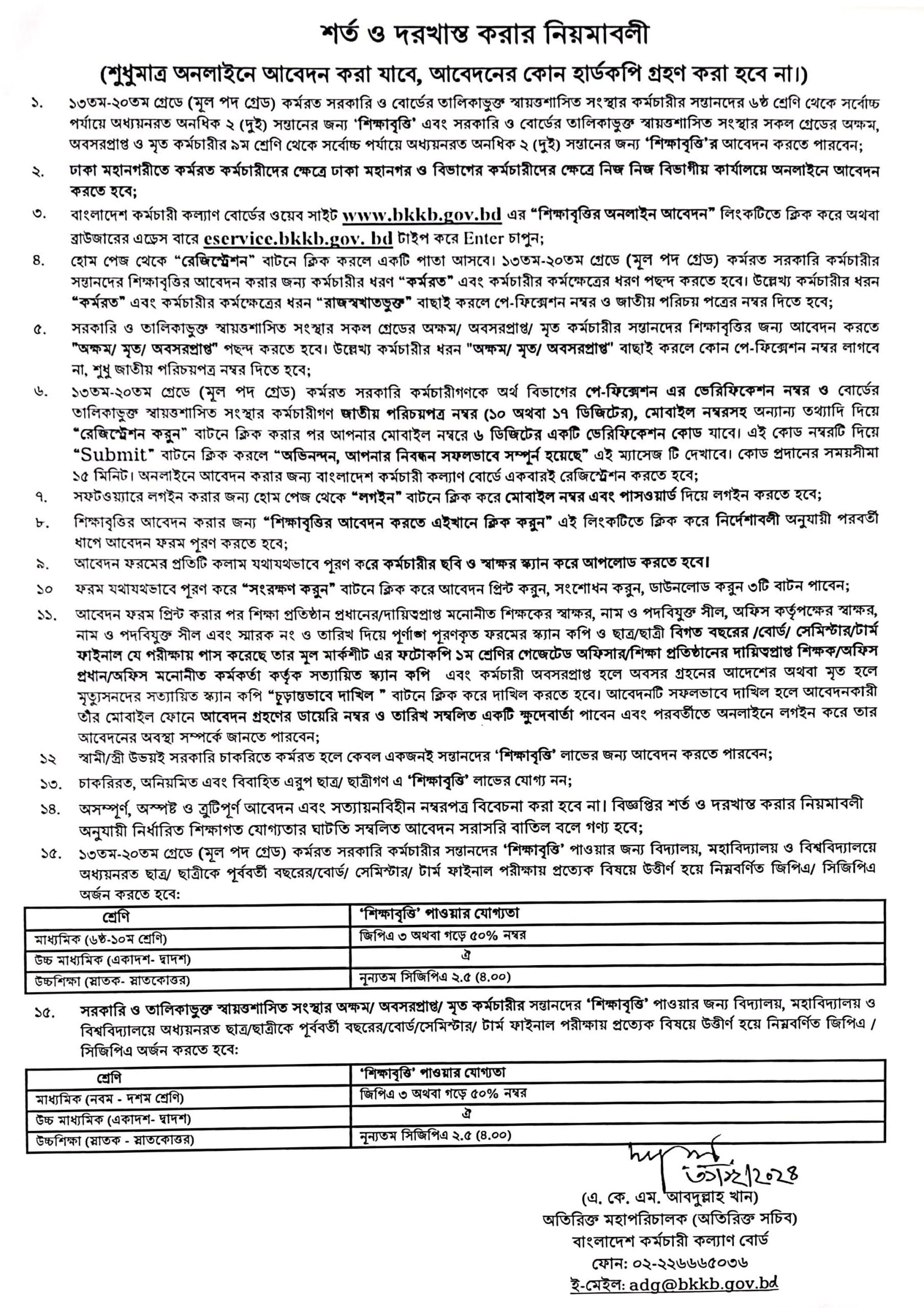 বি:দ্র: যাদের সন্তান সরকারি স্কুল কলেজে পড়াশুনা করতে পারেন না তাদের ক্ষেত্রেও আবেদন করা যাবে। মেধাবী কিন্তু পর্যাপ্ত অর্থ অভাবে ভাল শিক্ষা প্রদান করা সম্ভব হচ্ছে না। ১৩-২০ গ্রেডের কর্মচারীদের সন্তানদের শিক্ষার মান উন্নয়নের জন্য মূলত বাংলাদেশ কর্মচারী কল্যাণ বোর্ড শিক্ষা বৃত্তির ব্যবস্থা করেছে। তাছাড়া আপনার মূল বেতনে হতে প্রতিমাসে সর্বোচ্চ ১৫০ টাকা হারে কল্যান তহবিলে কর্তন হচ্ছে তাই আপনি যদি একটু নিডি হয়ে থাকেন তবে অবশ্যই শিক্ষা বৃত্তির জন্য আবেদন করুন।