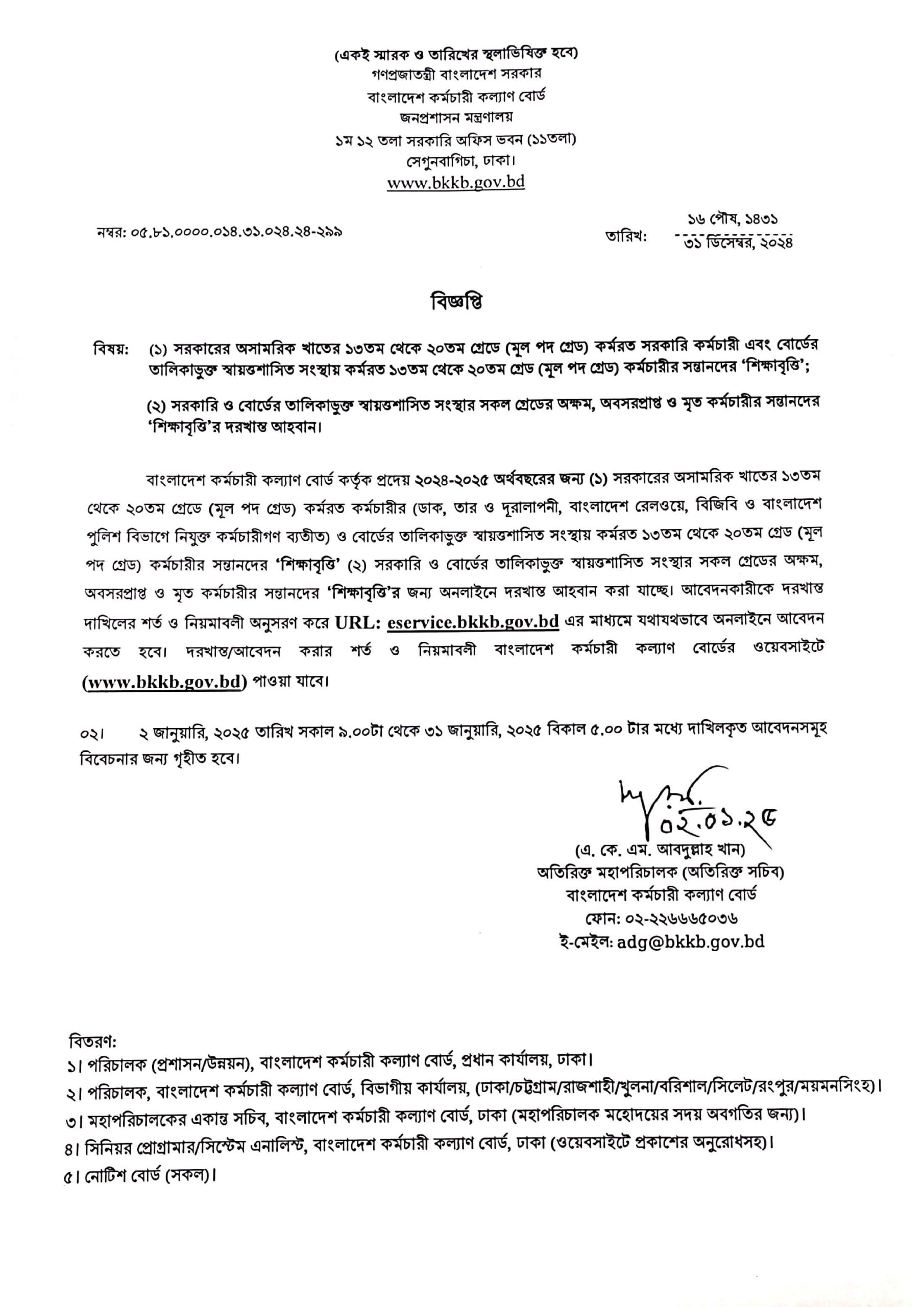 শিক্ষাবৃত্তি প্রদানের জন্য অনলাইনে দরখাস্ত আহবানের বিজ্ঞপ্তি ২০২৪