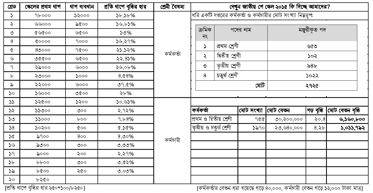 বড় বৈষম্যটা কোথায়? শতাংশে দেখলে বুঝা যায় বৈষম্যটা। কর্মকর্তাদের জন্য ১২৫০০ থেকে ৭৮ হাজার পর্যন্ত শুধুমাত্র মূল বেতনে ১০তম -১ম গ্রেডে প্রতি ধাপে প্রায় ২০.৪ শতাংশ বেতন বৃদ্ধি পেয়েছে। মূল বেতনে ২০.০৪% বেতন প্রতি প্রমোশন এ বৃদ্ধি পায়। গ্রেডে বেতন বৃদ্ধি ২০% এর অধিক হওয়ায় বার্ষিক ৫% ইনক্রিমেন্ট বা যে কোন প্রকার ফিক্সেশনের তাদের আর্থিক সুবিধা বেশি হয়ে থাকে ফলে তারা প্রমোশনে অনুপ্রাণিত হন। অন্য দিকে কর্মচারীদের ১১-২০ গ্রেডের পার্থক্য ২-৩% মাত্র।
