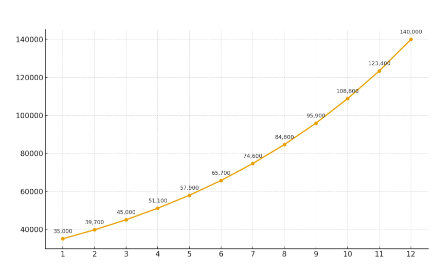 | সর্বনিম্ন (Grade 12) = ৳35,000 | সর্বোচ্চ (Grade 1) = ৳140,000 (১:৪ অনুপাত বজায়) | প্রতিটি ধাপের গড় বৃদ্ধির হার ≈ 13.43% (জ্যামিতিক প্রগতিতে গ্রেড-টু-গ্রেড বৃদ্ধি) |