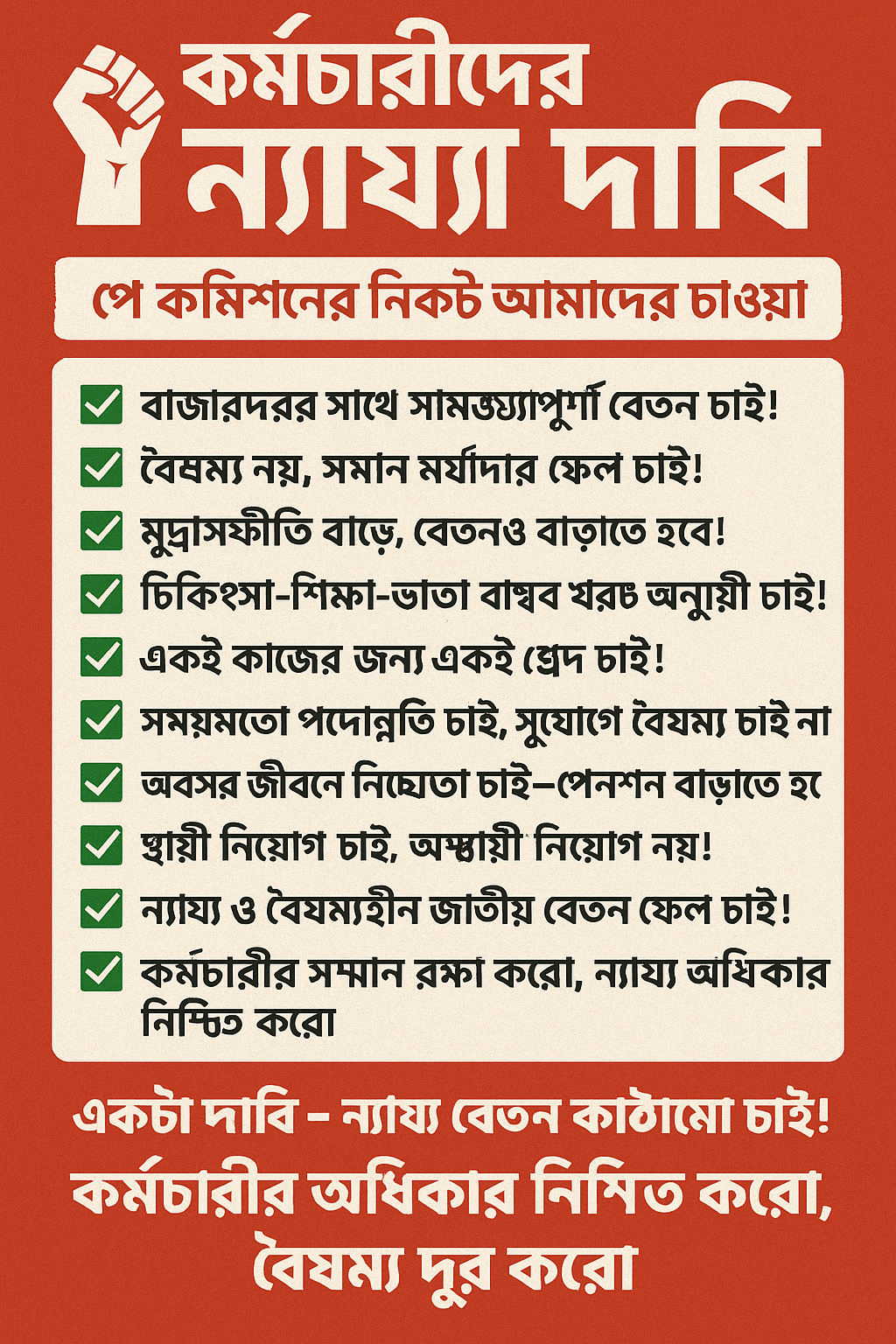 👉 সহজভাবে বললে, কর্মচারীরা চান ন্যায্য, বৈষম্যহীন ও জীবনযাত্রার ব্যয়ের সাথে সামঞ্জস্যপূর্ণ বেতন ও ভাতা, যাতে তারা সম্মানজনকভাবে জীবনযাপন করতে পারেন।