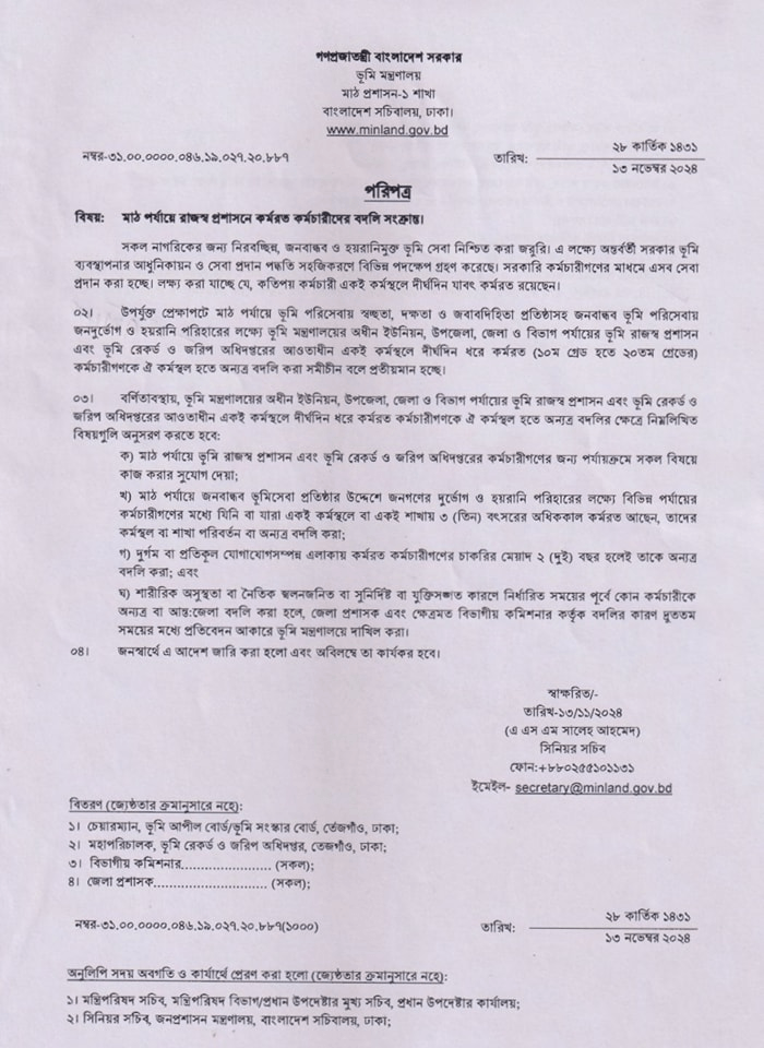 ভূমি মন্ত্রণালয়ের অধীন ব্যবস্থাপনা বিভাগের মাঠ পর্যায়ের কর্মচারীদের মধ্যে যাদের একই কর্মস্থলে ০৩ বছরের অধিক কার্যকাল অতিবাহিত হয়েছে, তাদের কর্মস্থল পরিবর্তন/বদলি নিয়ে কড়া নির্দেশনা জারি করেছে– Govt. Transfer Within 3 Years 2025