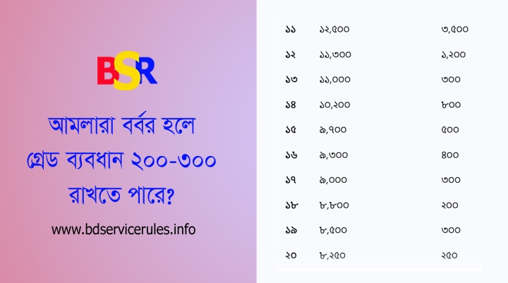 ২০১৫ সালের পে স্কেল পর্যালোচনা করে দেখা গেছে, বর্তমানে কয়েকটি গ্রেডের মধ্যে বেতনের ব্যবধান অত্যন্ত কম। উদাহরণস্বরূপ, ৮ম (২২ হাজার টাকা) এবং ৯ম গ্রেডে (২৩ হাজার টাকা) বেতনের ব্যবধান মাত্র ১০০০ টাকা। একইভাবে, ২০তম ও ১৯তম গ্রেডের মধ্যে ব্যবধান মাত্র ২৫০ টাকা, ১৭তম (৯০০০ টাকা) ও ১৮তম গ্রেডের (৮৮০০ টাকা) মধ্যে ২০০ টাকা, এবং ১২তম ও ১৩তম গ্রেডের মধ্যে ৩০০ টাকা। কমিশন মনে করছে, কম ব্যবধান থাকা এই গ্রেডগুলোকে ভেঙে সংখ্যা কমিয়ে আনা সম্ভব, যা একটি যৌক্তিক ও সুষম বেতন কাঠামো তৈরি করবে।