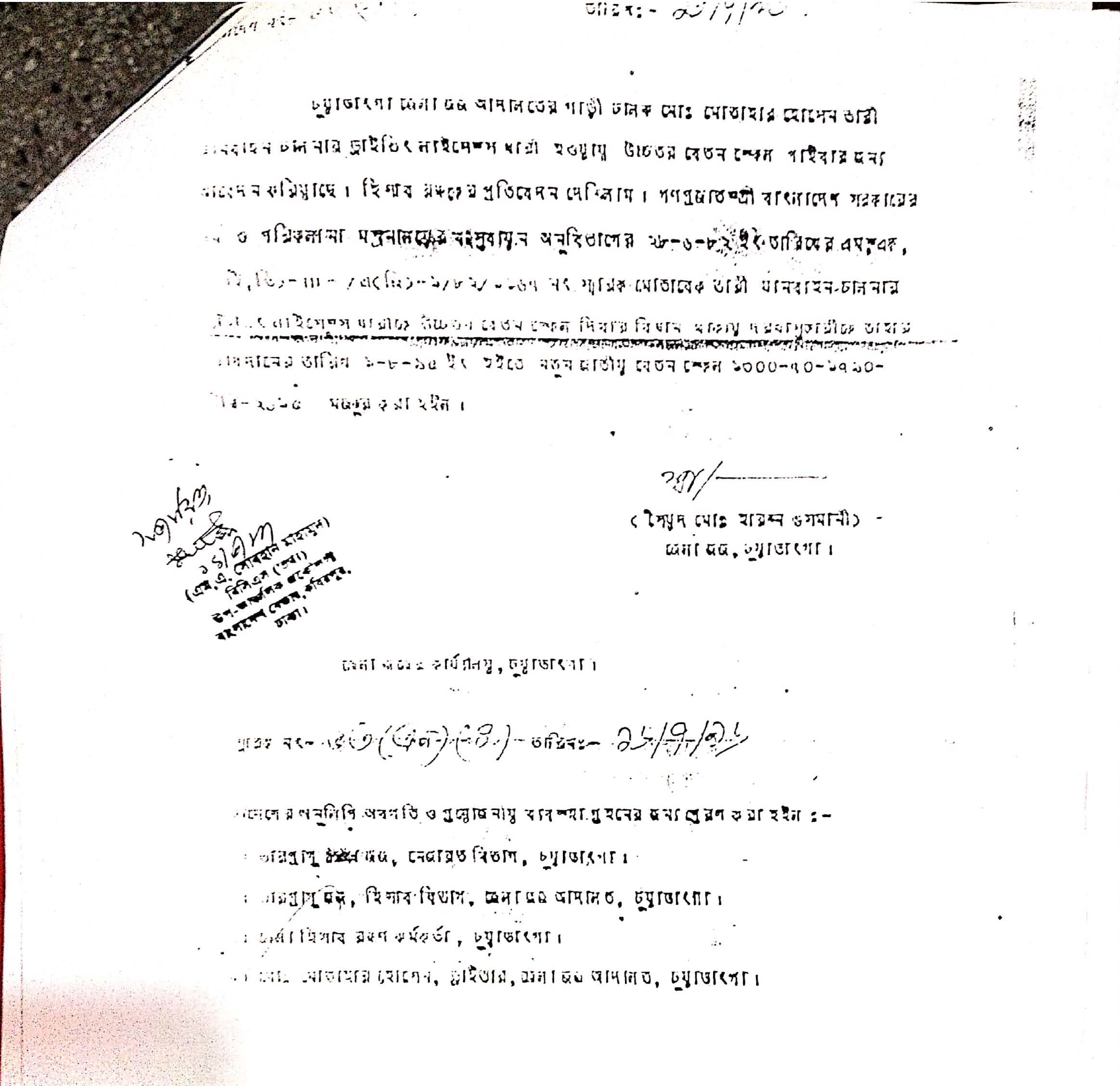 চূয়াডাংগা জেলা জজ আদালতের গাড়ী চালক মো: মোতাহার হোসেন ভারী যানবাহন চালনার ড্রাইভিং লাইসেন্স ধারী হওয়ায় উচ্চতর বেতন স্কেল পাইবার জন্য আবেদন করিয়াছে। হিসাব রক্ষকের প্রতিবেদন দেখিলাম। গণপ্রজতান্ত্রী বাংলাদেশ সরকার ও পরিকল্পনা মন্ত্রণালয়ের বাস্তবায়ন অনুবিভাগের ২৮-০৬-১৯৮২ ইং তারিখে জারিকৃত এম.এফ (আই.ডি)-III-এ<জি>-১/৮২/১১৬৭ নং স্মারক মোতাবেক ভারী যানবাহন চালনার লাইসেন্স থাকায় উচ্চতর বেতন স্কেল দিবার বিধান থাকায় দরখাস্তকারীকে তাহার যোগদানের তারিখ ১-৮-৯৫ইং হইতে নতুন জাতীয় বেতন স্কেল ১৩০০-৭০-১৭৯০-৩০৫-২০৯৫ মঞ্জুর করা হইল।