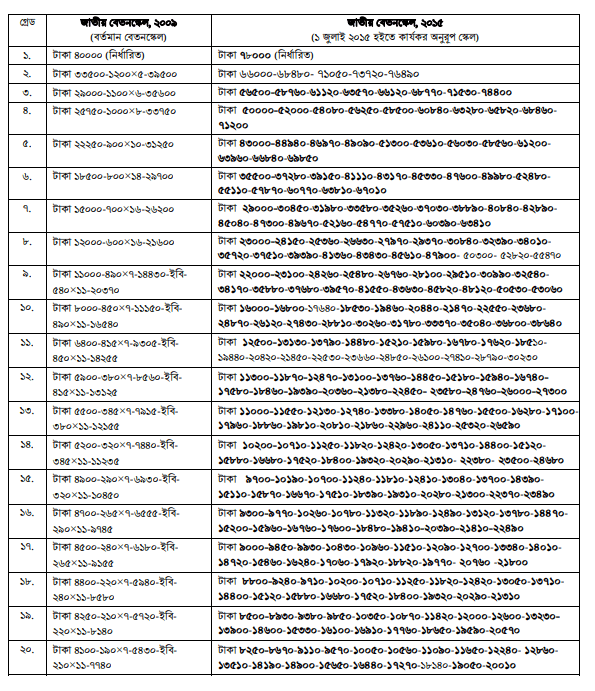 বর্তমান পে স্কেল-২০১৫ কার্যকর রয়েছে। জাতীয় পে স্কেল ২০১৫ একটি কর্মকর্তা ও কর্মচারী বৈষম্যমূলক পে স্কেল-যেখানে ১১-২০ তম গ্রেডে প্রতিটি স্কেলের ধাপ দূরত্ব গড়ে ৪% অপর দিকে ১-১০ নম্বর গ্রেডে প্রতিটি স্কেলে ধাপ দূরত্ব গড়ে ২০% । যা পৃথিবীর ইতিহাসে অন্য কোন দেশে এ চরম বৈষম্য দেখা যায় না-জাতীয় বেতন কাঠামো বৈষম্য ১৯৭৭-২০১৫