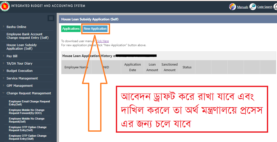 - Budget Execution > House Loan Subsidy Application (Self) > Entry তে ক্লি করে National ID Number এন্ট্রি করে GO বাটনে ক্লিক করতে হবে।