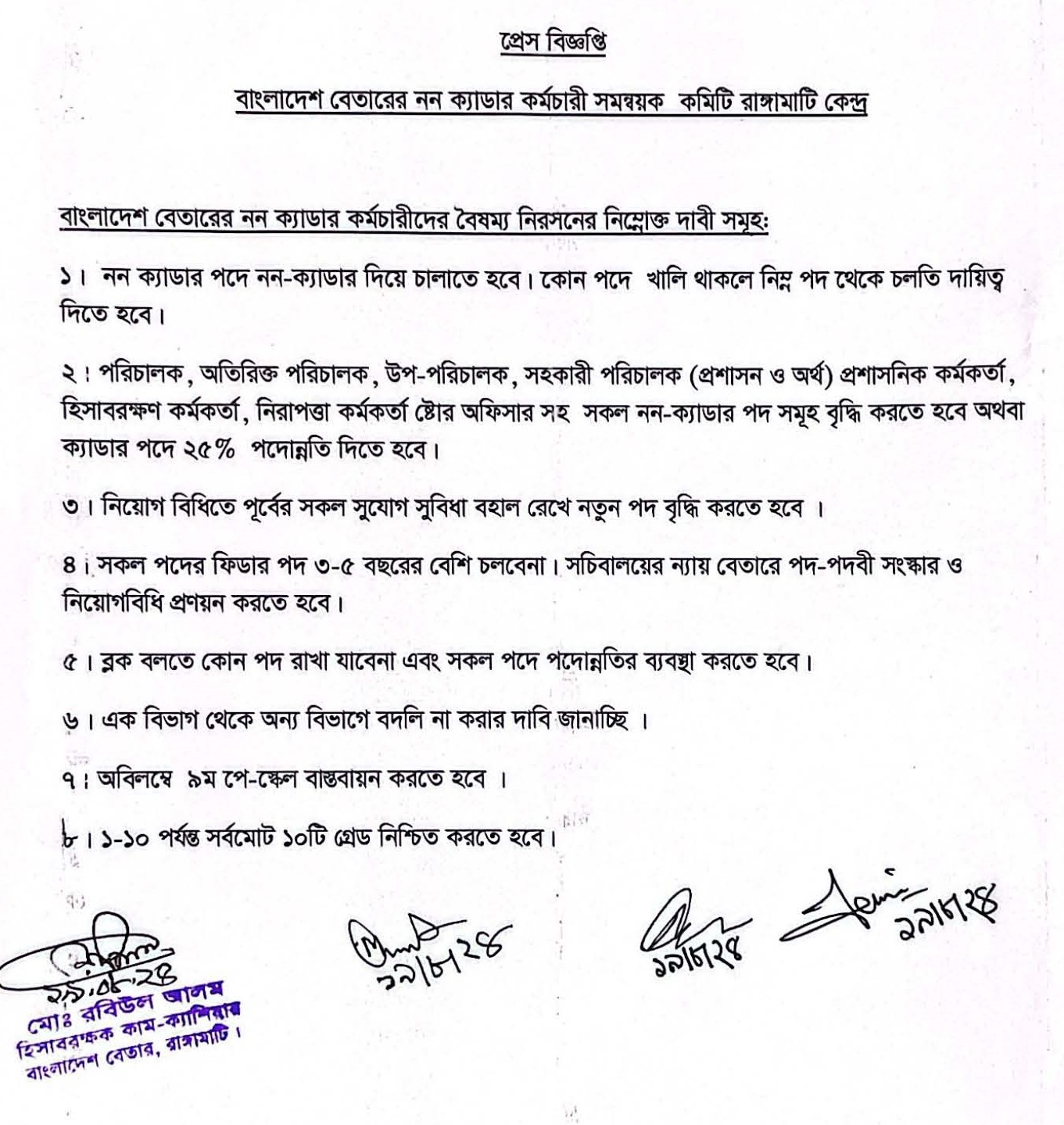 - বাংলাদেশ বেতারের কর্মকর্তাদের পদোন্নতি বঞ্চনার অবসান করতে হবে।
