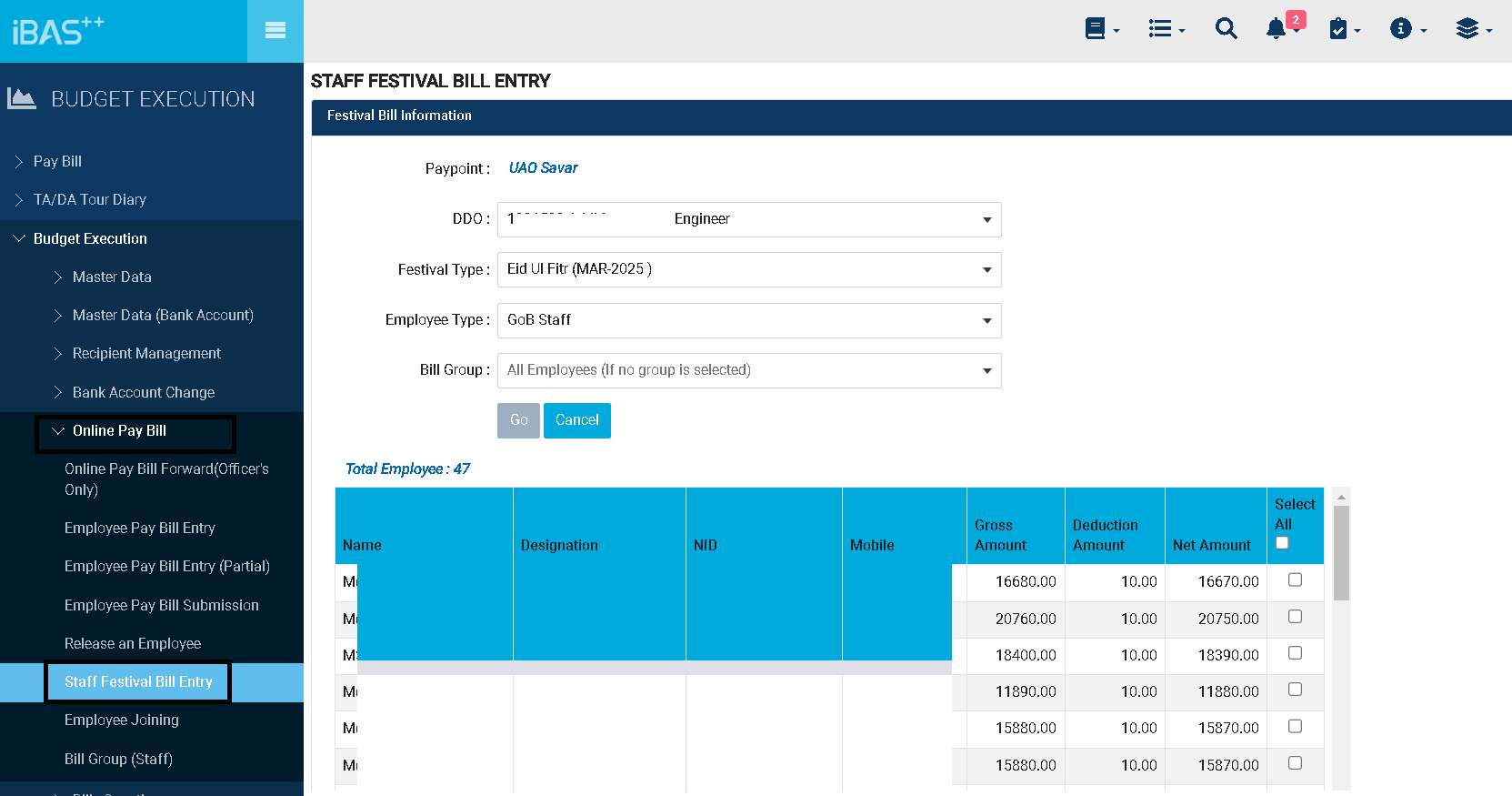 - কর্মচারীদের ক্ষেত্রে Budget Execution>Online Pay bill>Staff Festival Bill Entry এ গিয়ে বিল এন্ট্রি করতে হবে।