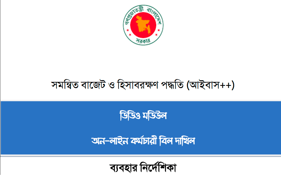 সমন্বিত বাজেট ও হিসাবরক্ষণ পদ্ধতি (আইবাস++), ডিডিও মডিউল, অনলাইন কর্মচারী বিল দাখিল ব্যবহার নির্দেশিকা ও পদ্ধতি বর্ণনা। এটি প্রস্তুত করেছেন সরকারি ব্যবস্থাপনা শক্তিশালীকরণ কর্মসূচী, অর্থ বিভাগ, অর্থ মন্ত্রণালয়।