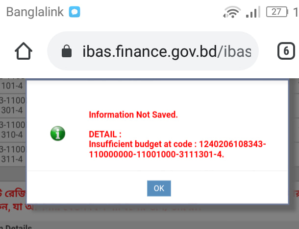 তখন অনলাইনে বিল দাখিল করতে গেলে budget insufficient at the code xxxxxxxxxxxxx-110000000-11001000-3111306-4 এই বর্তাটি পাবেন ৷
