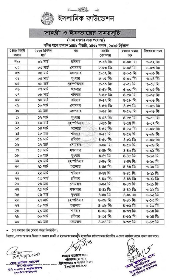 ইসলামিক ফাউন্ডেশন কর্তৃক প্রণীত ইফতার ও সেহরির সময়সূচি বাংলাদেশের মুসলমানগণ অনুসরণ করে থাকে-প্রতিবছরই ইসলামিক ফাউন্ডেশন ইফতার ও সেহরী সময়সূচি প্রকাশ করে থাকে- সাহরী ও ইফতারের সময়সূচি ২০২৫