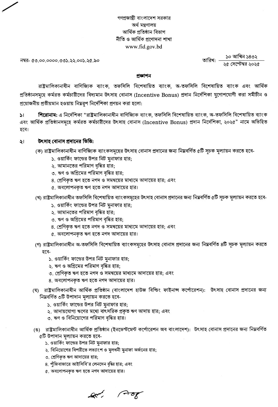 অর্থ মন্ত্রণালয়ের আর্থিক প্রতিষ্ঠান বিভাগ রাষ্ট্রায়ত্ত বাণিজ্যিক ব্যাংক ও আর্থিক প্রতিষ্ঠানের কর্মীদের উৎসাহ বোনাস ব্যবস্থায় নতুন নির্দেশনা জারি করেছে। বৃহস্পতিবার (২৫ সেপ্টেম্বর) প্রকাশিত এ নির্দেশনায় উৎসাহ বোনাস প্রদানের ক্ষেত্রে গুরুত্বপূর্ণ পরিবর্তন আনা হয়েছে।