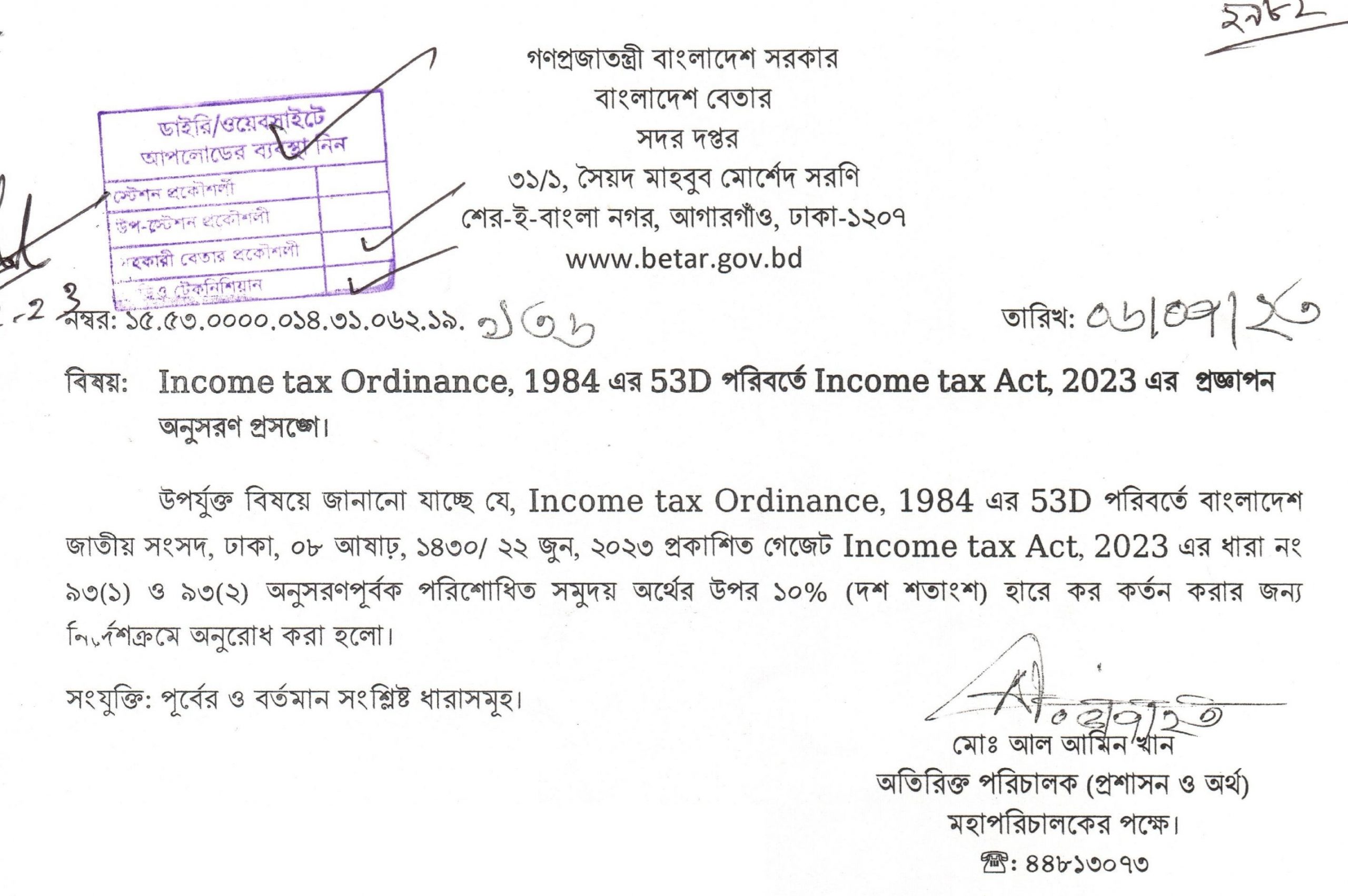 Income tax Ordinance, 1984 এর 53D পরিবর্তে Income tax Act,.2023 এর প্রজ্ঞাপন অনুসরণ প্রসঙ্গে।