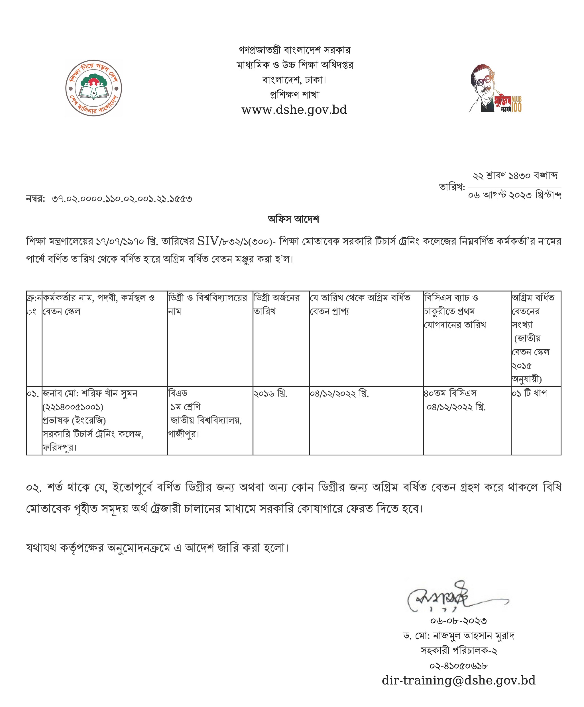০১ জুলাই ২০১৮ হতে ৩০ জুন ২০২১ পর্যন্ত এবং বিভিন্ন সময়ে বেসরকারি (স্কুল ও কলেজ) শিক্ষাপ্রতিষ্ঠানের শিক্ষক/কর্মচারীগণের উচ্চতর পদে যোগদান, পদোন্নতি, উচ্চতর গ্রেড এবং বি.এড স্কেল প্রাপ্তির কারণে সঠিক নিয়ম অনুসরণ না করে বেতন নির্ধারণ (pay fixation) করার ফলে উচ্চতর পদে উচ্চতর গ্রেড প্রাপ্তদের অনুকূলে তাঁদের প্রাপ্য বেতনের কম বা বেশি বেতন-ভাতা বরাদ্দ যাচ্ছে। এর ফলে বিভিন্ন প্রকার জটিলতা এবং আর্থিক বিশৃঙ্খলা সৃষ্টি হচ্ছে। মাধ্যমিক উচ্চ শিক্ষা অধিদপ্তরের ১১/১১/২০২১ ইং তারিখের সভার সিদ্ধান্ত মোতাবেক যে সকল শিক্ষক-কর্মচারী প্রাপ্যতার অতিরিক্ত অর্থ গ্রহণ করেছেন, গৃহীত অতিরিক্ত অর্থ চালানের মাধ্যমে সরকারি কোষাগারে ফেরত প্রদানের সিদ্ধান্ত গৃহীত হয়েছে। এমতাবস্থায়, যে সকল শিক্ষক-কর্মচারীগণের মূল বেতন যথাযথভাবে নির্ধারিত হয়নি এবং প্রাপ্যতার অতিরিক্ত অর্থ গ্রহণ করেছেন তাদেরকে আঞ্চলিক কার্যালয় থেকে অনলাইনে বিধি মোতাবেক এম.পি.ও. সীটে বেতন স্কেল সংশোধন পূর্বক গৃহীত অতিরিক্ত অর্থ চালানের মাধ্যমে ৭ মার্চ ২০২২ ইং তারিখের মধ্যে সরকারি কোষাগারে ফেরত প্রদান করার জন্য নির্দেশক্রমে অনুরোধ করা হলো। এ নির্দেশনা প্রতিপালনে ব্যর্থতায় প্রতিষ্ঠান প্রধানসহ সংশ্লিষ্ট সকলে দায়ী থাকবেন এবং তাঁদের বিরুদ্ধে বিধি মোতাবেক ব্যবস্থা গ্রহণ করা হবে।