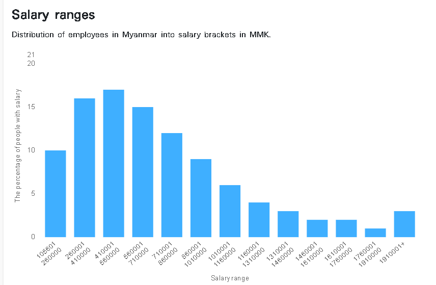 মিয়ানমারে কর্মরত কর্মচারীদের বেতন পরিসীমা, ডিফল্টভাবে, ২৫৯,৭১৩ MMK (সর্বনিম্ন বেতন, কর্মচারীদের প্রকৃত মজুরি আরও কম হতে পারে) থেকে ১,৩৬৩,৯২৪ MMK (সর্বোচ্চ বেতন, প্রকৃত বেতন আরও বেশি হতে পারে) এটি বোনাস সহ মোট মাসিক বেতন। ১ বাংলাদেশী টাকা সমান ২৭.১৭ বর্মী ক্যত (MMK)।