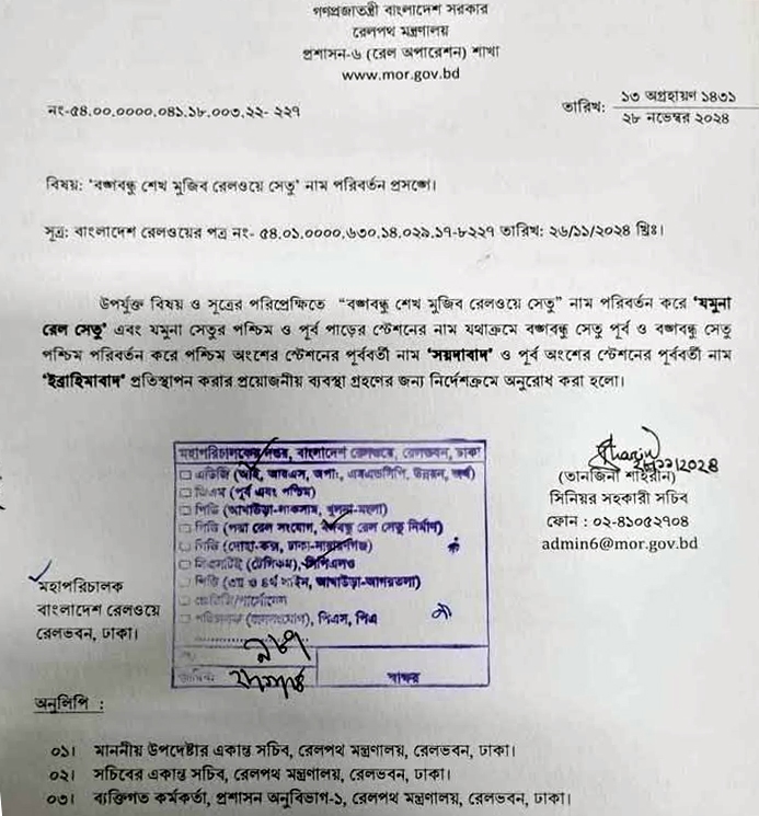 যমুনা সেতু এবং রেলওয়ে স্টেশনের নাম পরিবর্তন করে প্রজ্ঞাপন জারি করা হয়েছে। উপমহাদেশের প্রথম মুসলিম প্রিন্সিপাল, শিক্ষাবিদ ও সমাজ সংস্কারক প্রিন্সিপাল ইবরাহীম খাঁ-র নামানুসারে যমুনাসেতুর পূর্ব পাড়ের রেলওয়ে স্টেশনের নাম রাখা হয়ে ছিলো ‘ইব্রাহিমাবাদ স্টেশন’। আওয়ামীলীগ সরকার এই নাম পরির্তন করে নামকরণ করেন ‘বঙ্গবন্ধু সেতু পূর্ব’ স্টেশন।