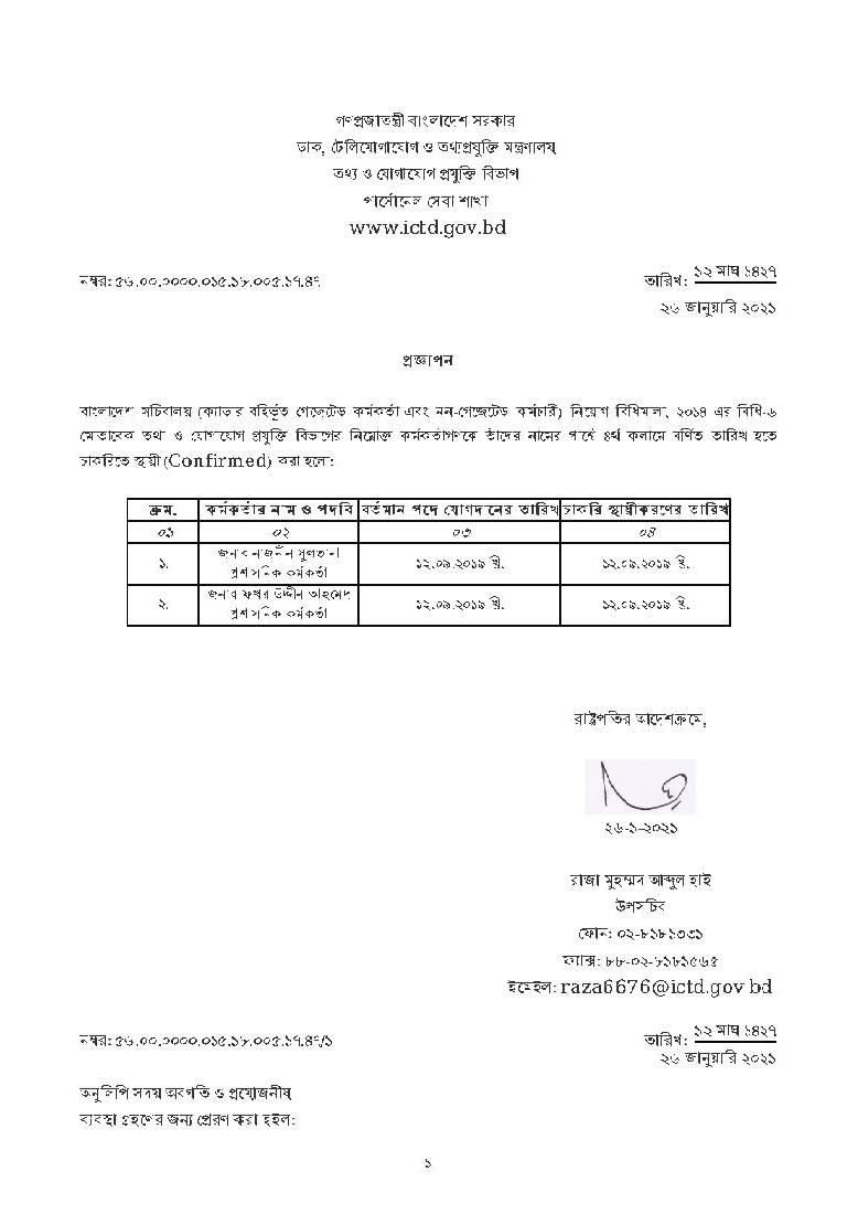 পদোন্নতির ১ বছর পূর্তিতে চাকুরী স্থায়ীকরণ আদেশ