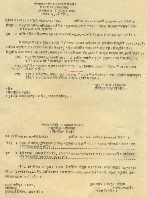 সংস্থাপন মন্ত্রণালয়ের, বাংলা ভাষা বাস্তবায়ন শাখার ১১-১২-১৯৯০ তারিখের সম(বাবাকো)-১০২/৯০-০১৪ নম্বর পত্র মোতাবেক পুরুষ ও মহিলাদের নামের পূর্বে যথাক্রমে “জনাব” ও “বেগম” শব্দ দুইটির সম্মানসূচক বর্তমান ব্যবহার যথারীতি চলিতে পারে। অর্থাৎ কোন সরকারি পত্র লেখার ক্ষেত্রে মহিলা অফিসারের ক্ষেত্রে বেগম ব্যবহার করা যাইবে।