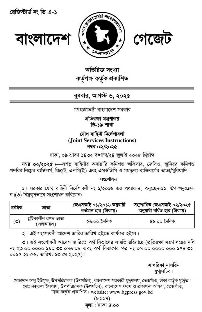 সশস্ত্র বাহিনীর অনারারি কমিশন্ড অফিসার, জেসিও, জুনিয়র কমিশন্ড পদবির নিম্নের ব্যক্তিবর্গ, রিক্রুট, এনসি(ই) এবং এমওডিসি ও সমতুল্য ব্যক্তিবর্গের ভাতা/সুবিধাদির মধ্যে রশদ ভাতা বৃদ্ধি করা হয়েছে– জেএসআই রশদ ভাতা ২০২৫