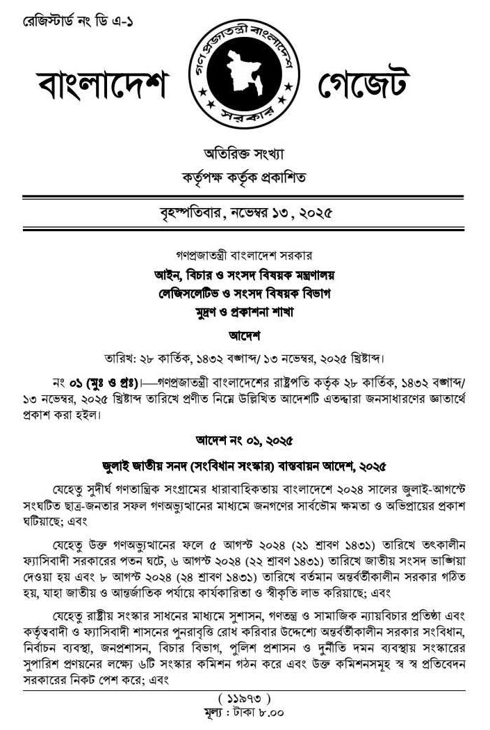 রাষ্ট্রপতির সইয়ের পর গেজেট প্রকাশ; ফেব্রুয়ারির প্রথমার্ধে হবে উভয় নির্বাচন- ঢাকা, নভেম্বর ১৪, ২০২৫ (সংবাদদাতা)- বহু প্রতীক্ষিত ‘জুলাই জাতীয় সনদ (সংবিধান সংস্কার) বাস্তবায়ন আদেশ, ২০২৫’ জারি করেছে সরকার। গত বৃহস্পতিবার (১৩ নভেম্বর, ২০২৫) রাষ্ট্রপতি মো. সাহাবুদ্দিনের স্বাক্ষরের পর আইন, বিচার ও সংসদ বিষয়ক মন্ত্রণালয়ের লেজিসলেটিভ ও সংসদ বিষয়ক বিভাগ থেকে এর গেজেট প্রকাশ করা হয়। এই আদেশের মাধ্যমে সংবিধান সংস্কারের প্রস্তাবগুলো গণভোটের মাধ্যমে জনগণের অনুমোদনের জন্য প্রস্তুত হলো।