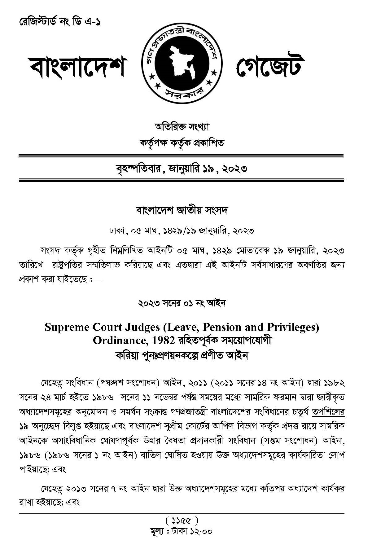 প্রধান বিচারপতি অসাধারণ পেনশন বাৎসরিক ১ লক্ষ ৫০ হাজার এবং আনুতোষিক ৪ লক্ষ ৫০ হাজার টাকা পাইবে – বিচারকগণ বাৎসরিক ১ লক্ষ ৪০ হাজার পেনশন এবং আনুতোষিক ৪ লক্ষ ৫০ হাজার টাকা প্র্যা হইবেন – বাংলাদেশ সুপ্রীম কোর্টের বিচারক আইন ২০২৫